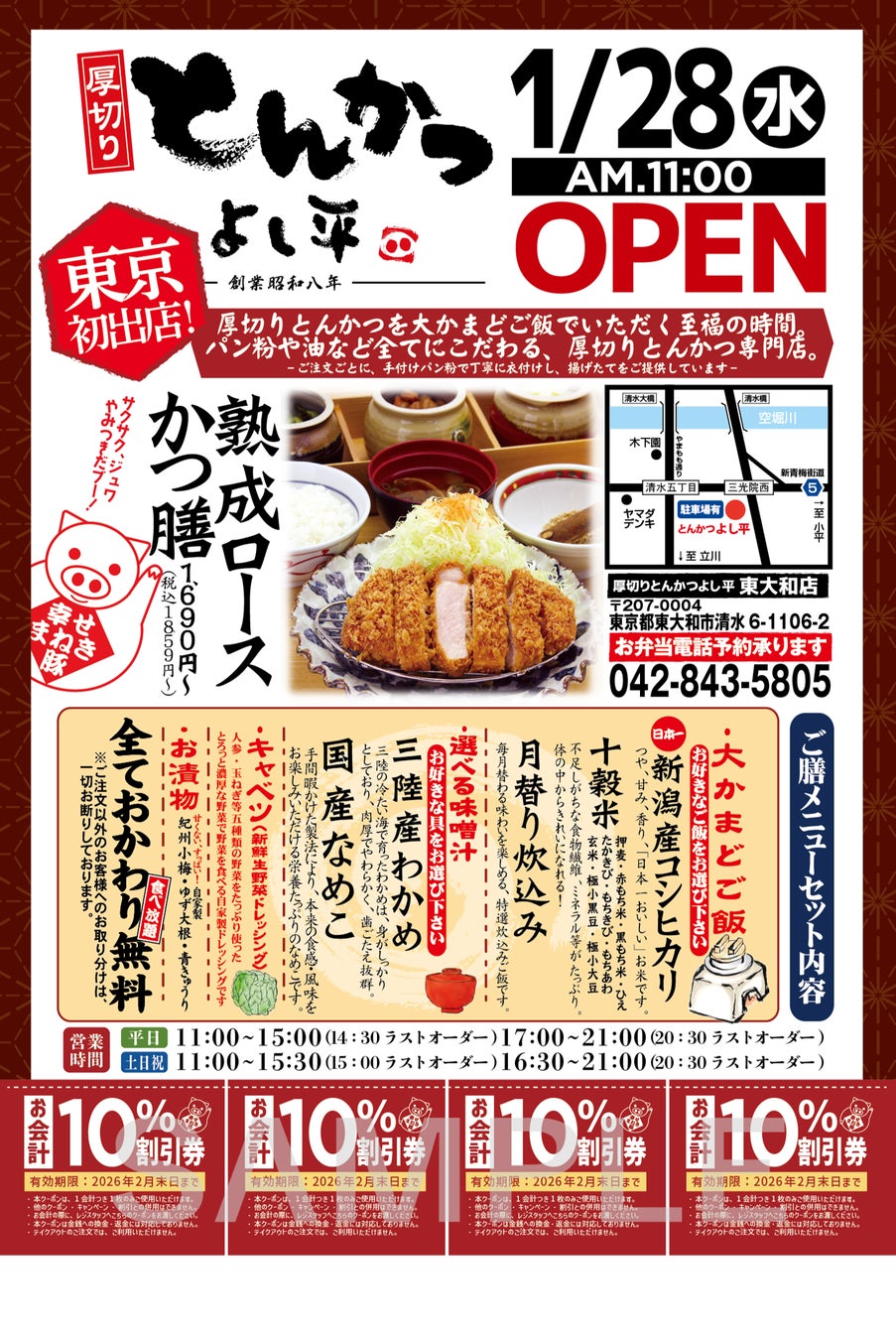 このたびオープンする『厚切りとんかつ よし平 東大和店』は、よし平ブランド15店舗目となる新店舗です。新青梅街道沿いの利便性が高く、周辺には自然が広がり公園などに囲まれている環境で、地域の皆さまの普段のお食事はもちろん、お出かけの途中にも気軽に立ち寄れるお店として、さまざまなシーンでお楽しみいただけます。