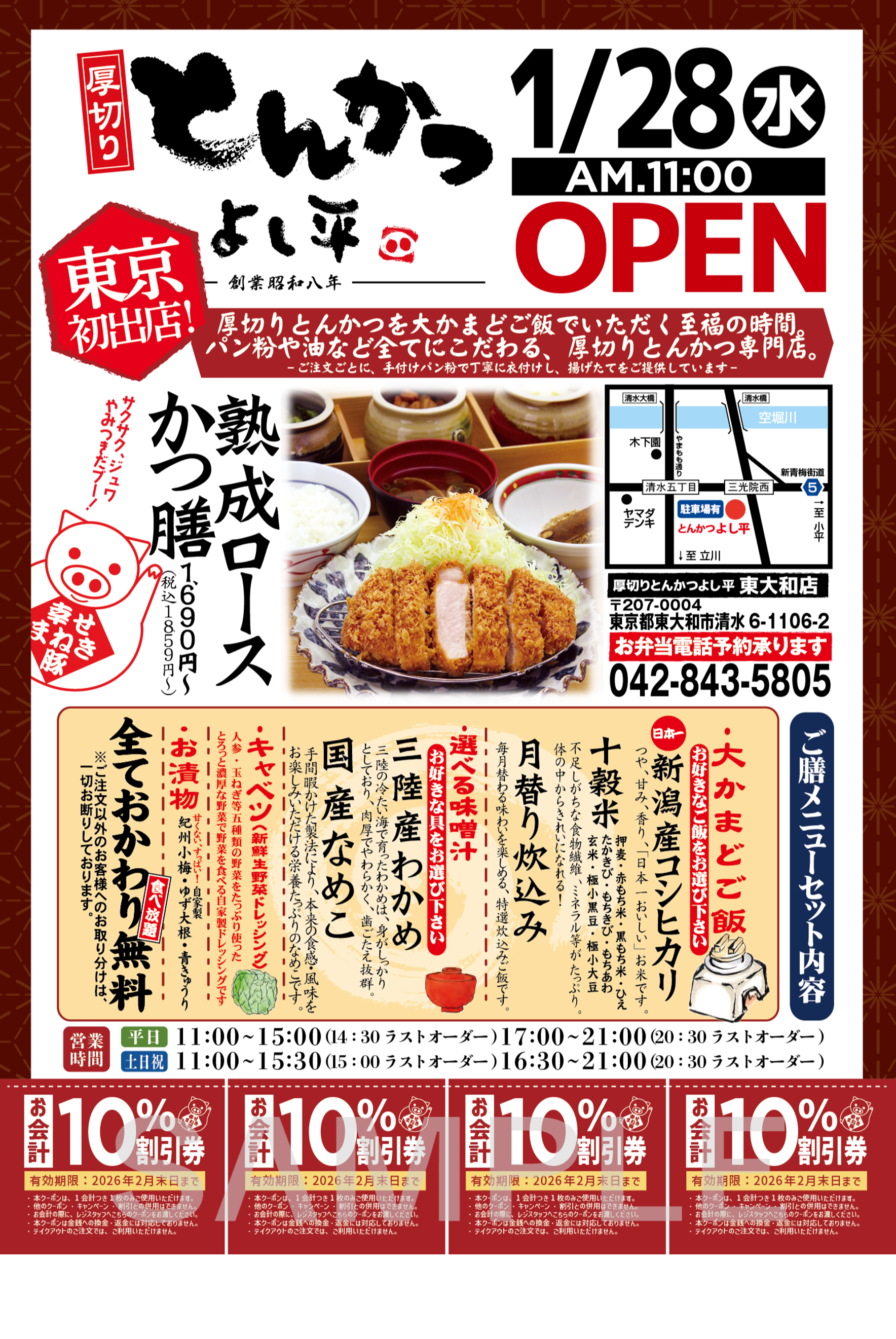このたびオープンする『厚切りとんかつ よし平 東大和店』は、よし平ブランド15店舗目となる新店舗です。新青梅街道沿いの利便性が高く、周辺には自然が広がり公園などに囲まれている環境で、地域の皆さまの普段のお食事はもちろん、お出かけの途中にも気軽に立ち寄れるお店として、さまざまなシーンでお楽しみいただけます。