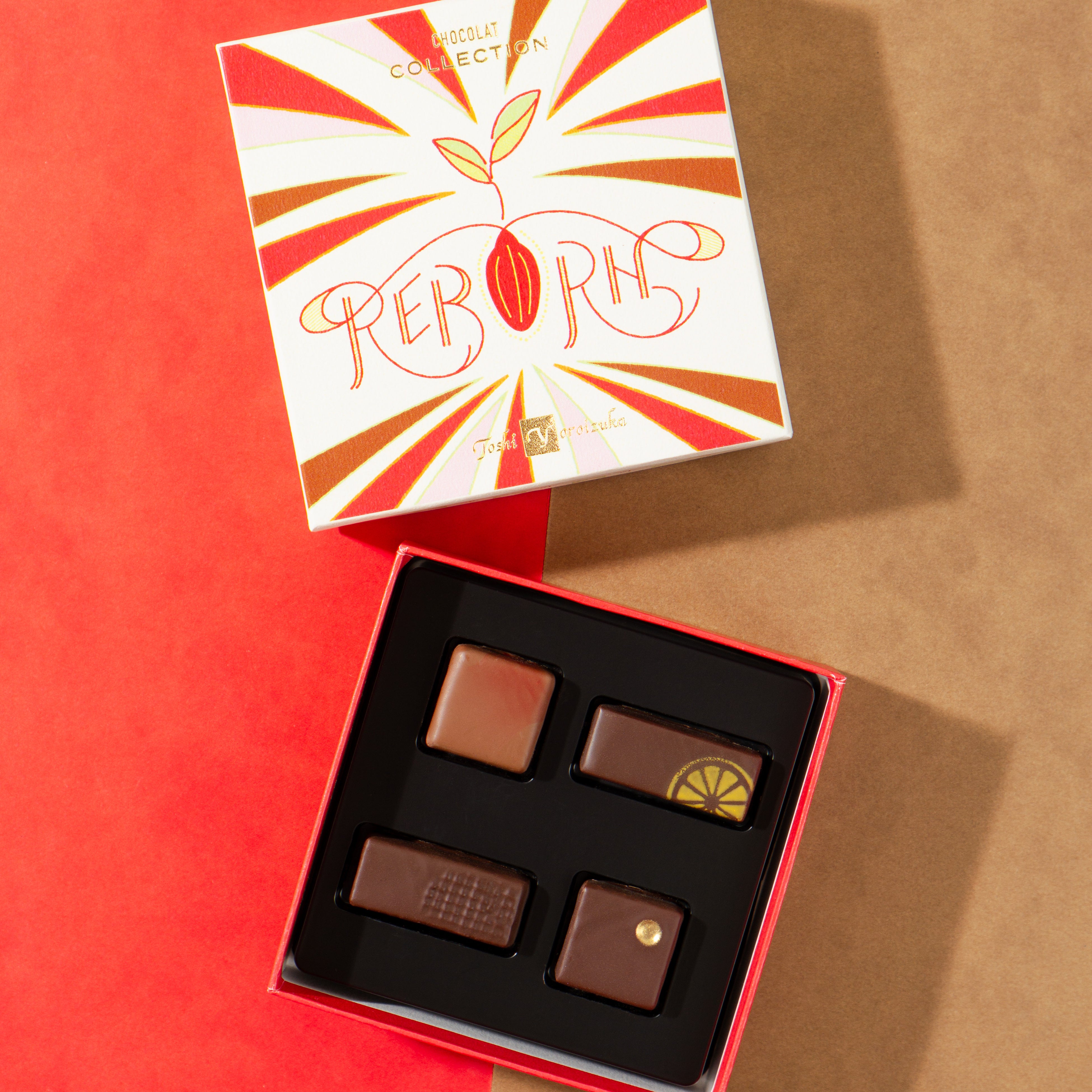 トシ・ヨロイヅカのスペシャリテ焼菓子「トシ・マンデルクローネ」をボンボンショコラで再現したショコラや、小田原のみかんやピスタチオなどを使用したシェフのこだわりを詰め込んだ至高の4粒。