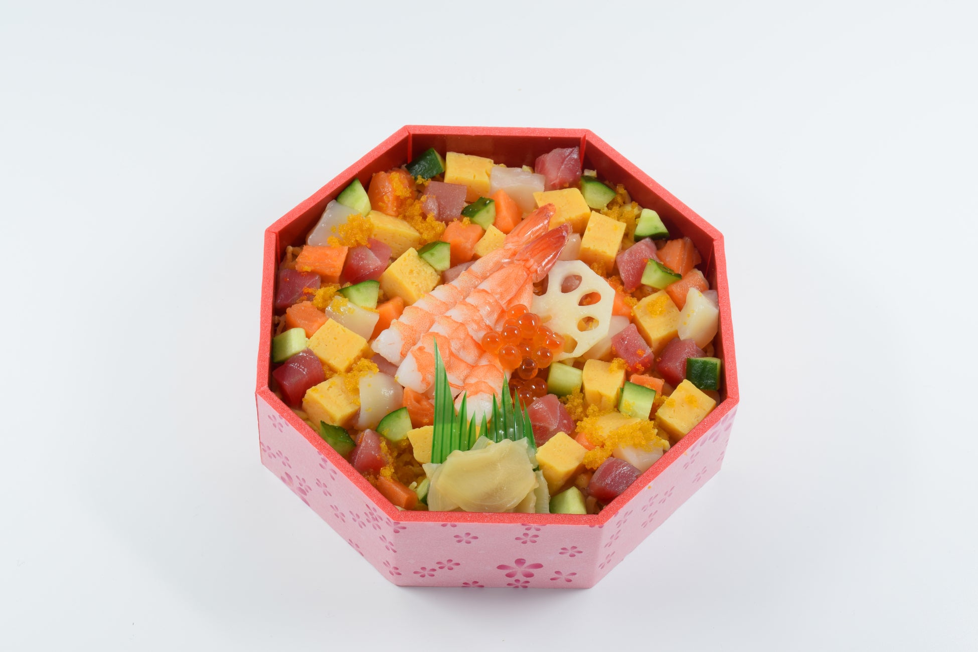 海老、まぐろ、サーモン、貝柱、いくら、からふとししゃも魚卵、玉子焼、錦糸玉子、きゅうり、酢レンコン