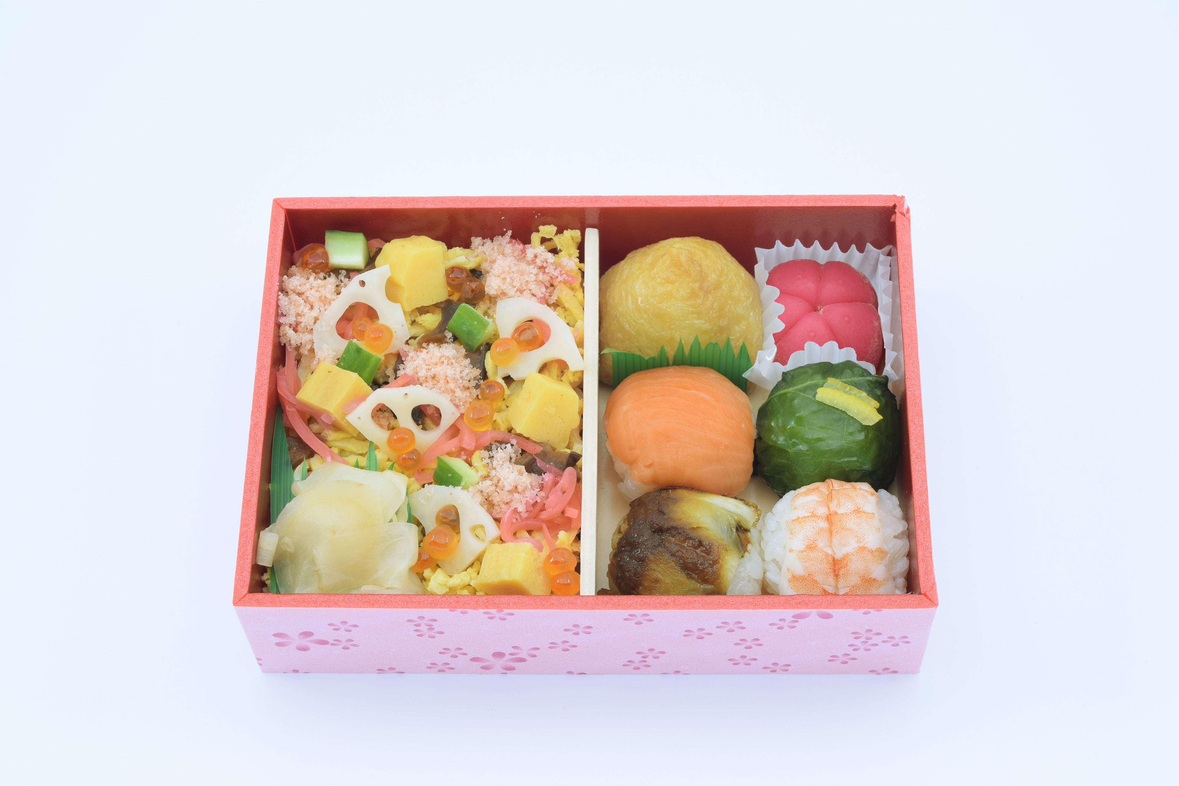 ちらし寿司、てまり寿司(サーモン・高菜・穴子・海老)、こいなり(金ごま)、花餅