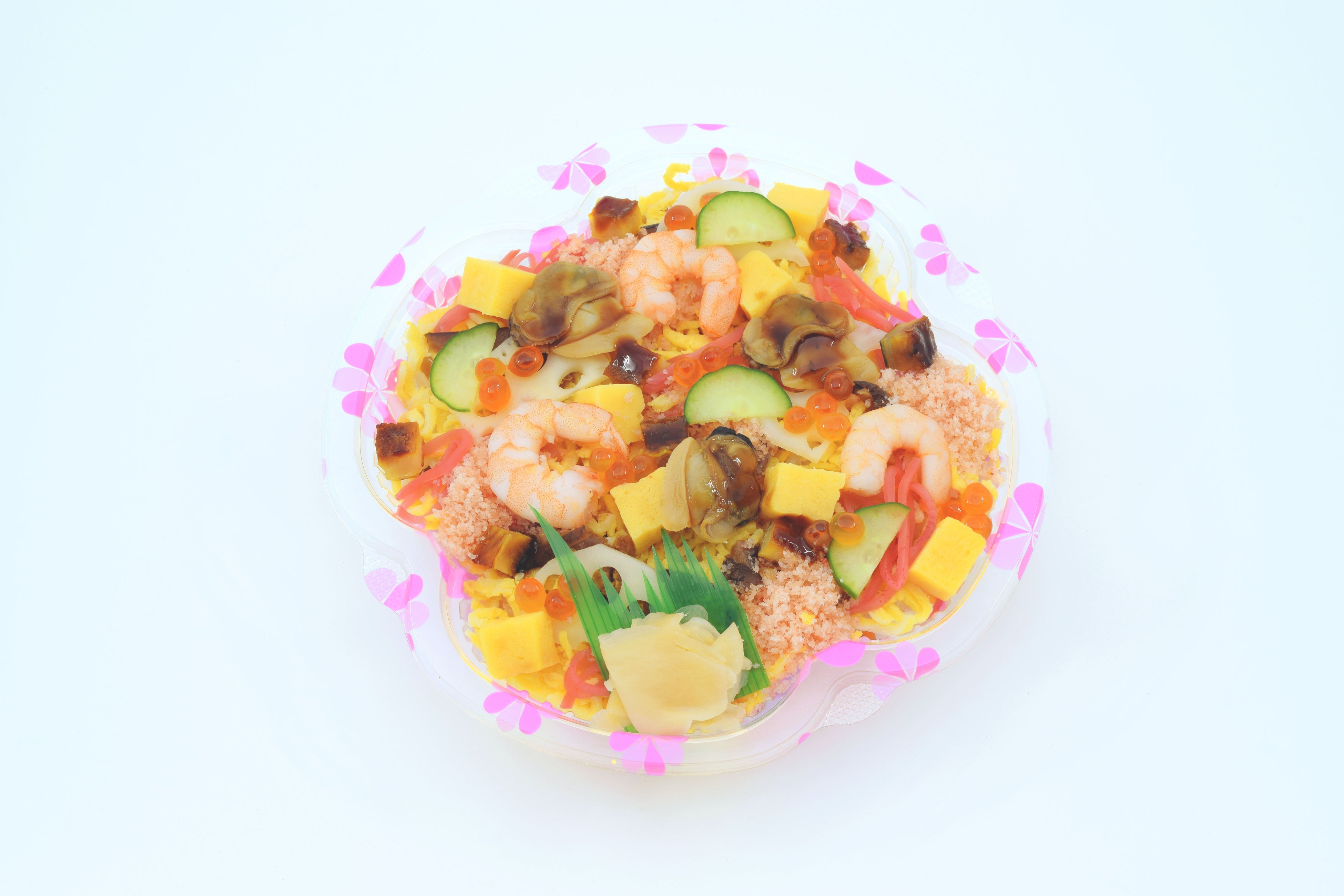 はまぐり、海老、穴子、いくら、玉子焼、椎茸、酢レンコン、おぼろ、紅生姜、錦糸玉子、きゅうり