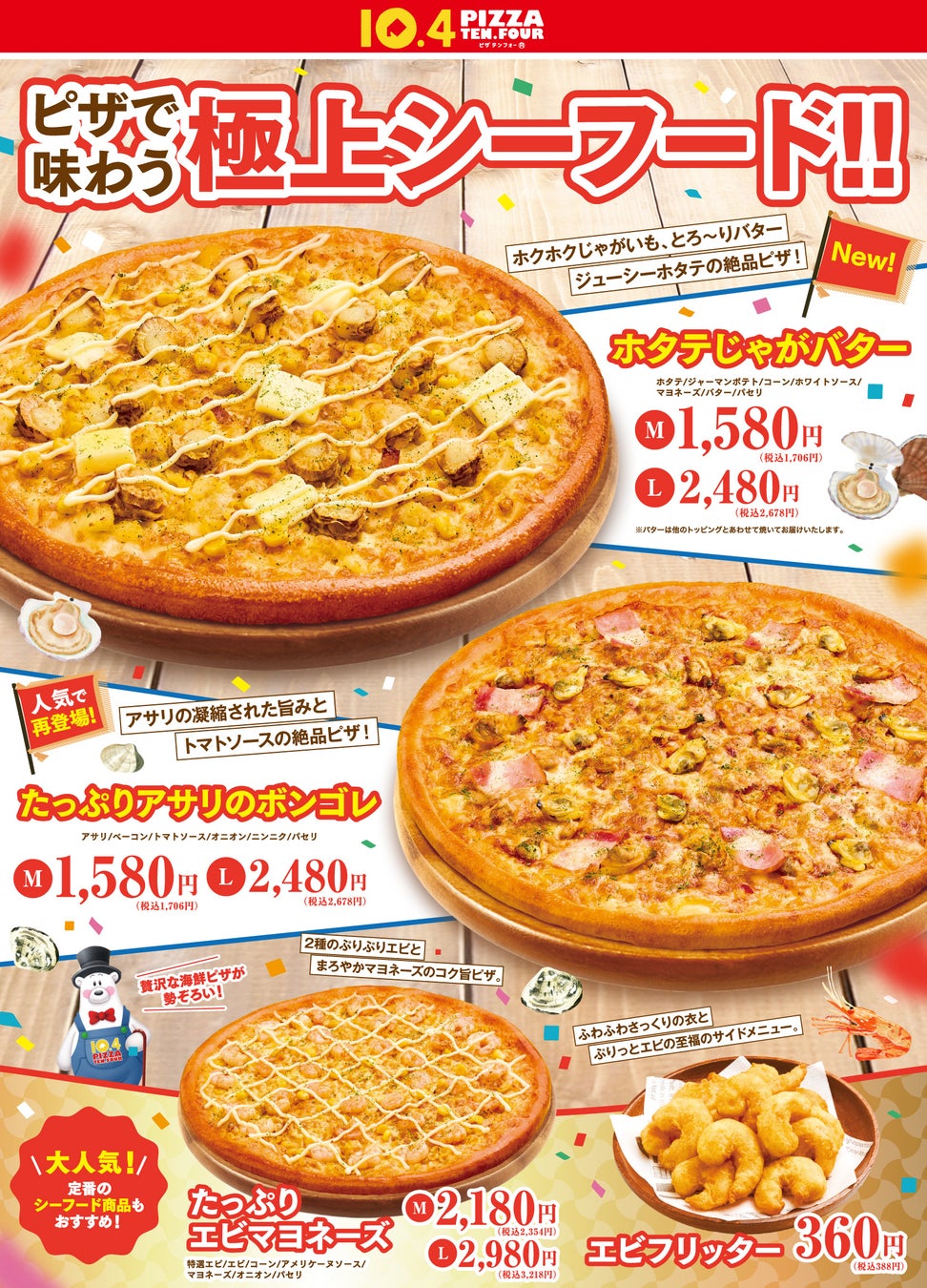 北海道生まれの宅配ピザチェーン10.4(テンフォー)を運営する、株式会社テンフォー(本社・北海道函館市/代表・髙橋仁志)は、ジューシーなホタテとホクホクのじゃがいも、濃厚なバターをあわせたピザ『ホタテじゃがバター』を2026年1月31日(土)より発売いたします。また昨年、期間限定で販売し再販売のリクエストの多かったピザ『たっぷりアサリのボンゴレ』をあわせて復刻販売いたします。