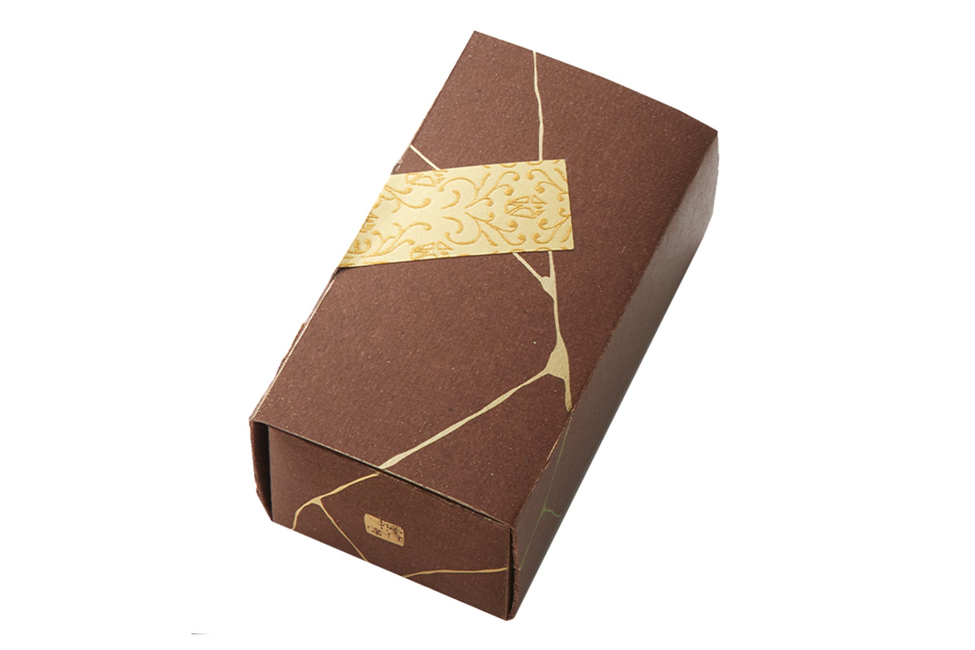 チョコレートをイメージした茶色の箱に「金継ぎ」をイメージしたゴールドのデザインをあしらいました。