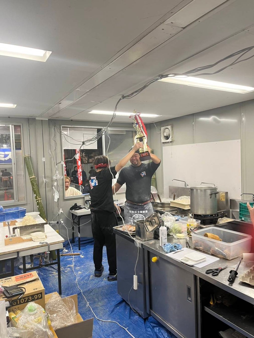 同じやり方では勝てない。イベントでは、どんぶりの大きさなど勝手が違うので、 お店と全く同じものは提供できないが、いつもの味に近づけることができれば勝機は あると考え、今回初めて麺はすべて「青竹打ち」を現場で行い、打ちたて、切りたて、 ゆでたての佐野らーめんを提供しました。
