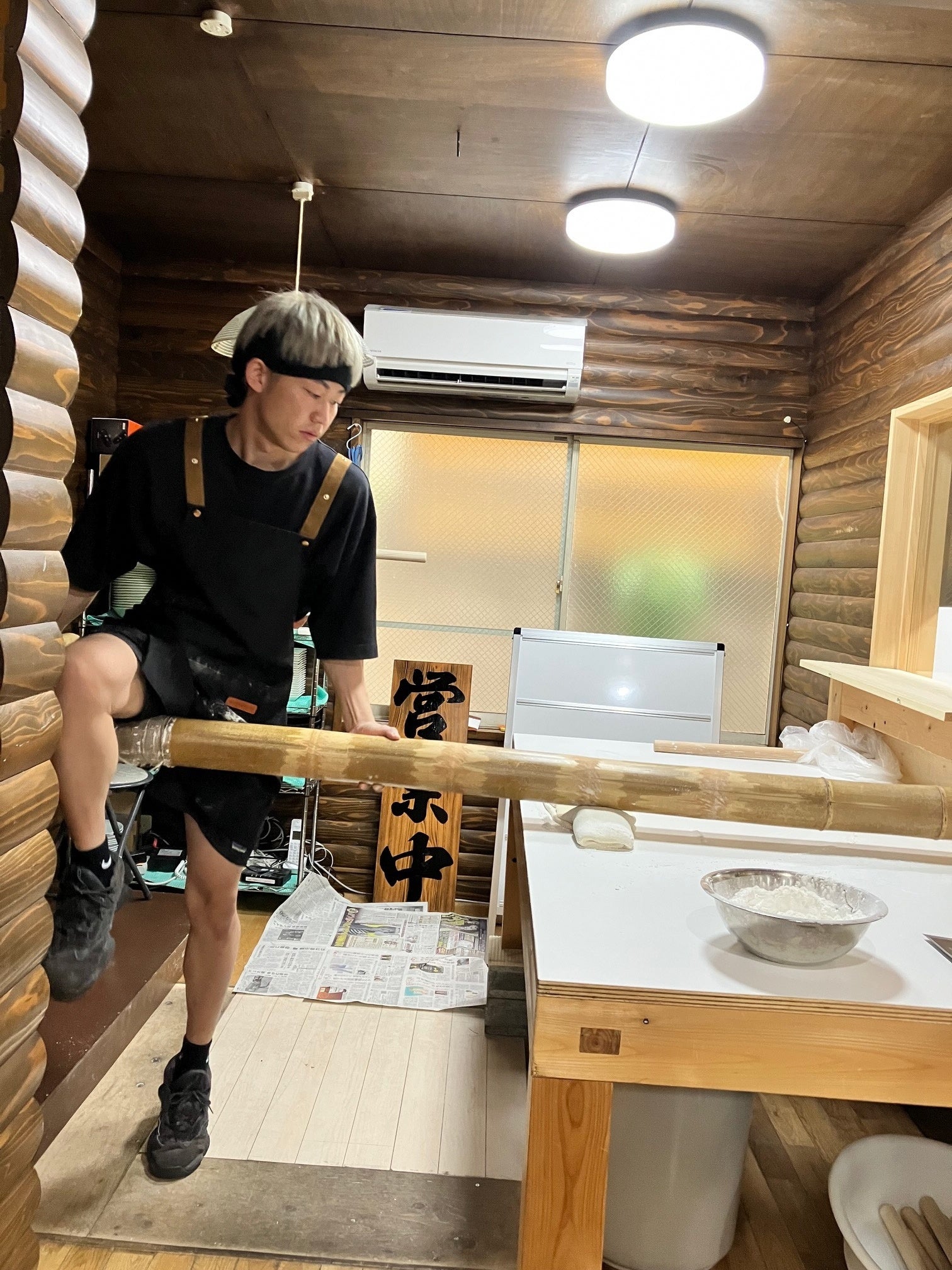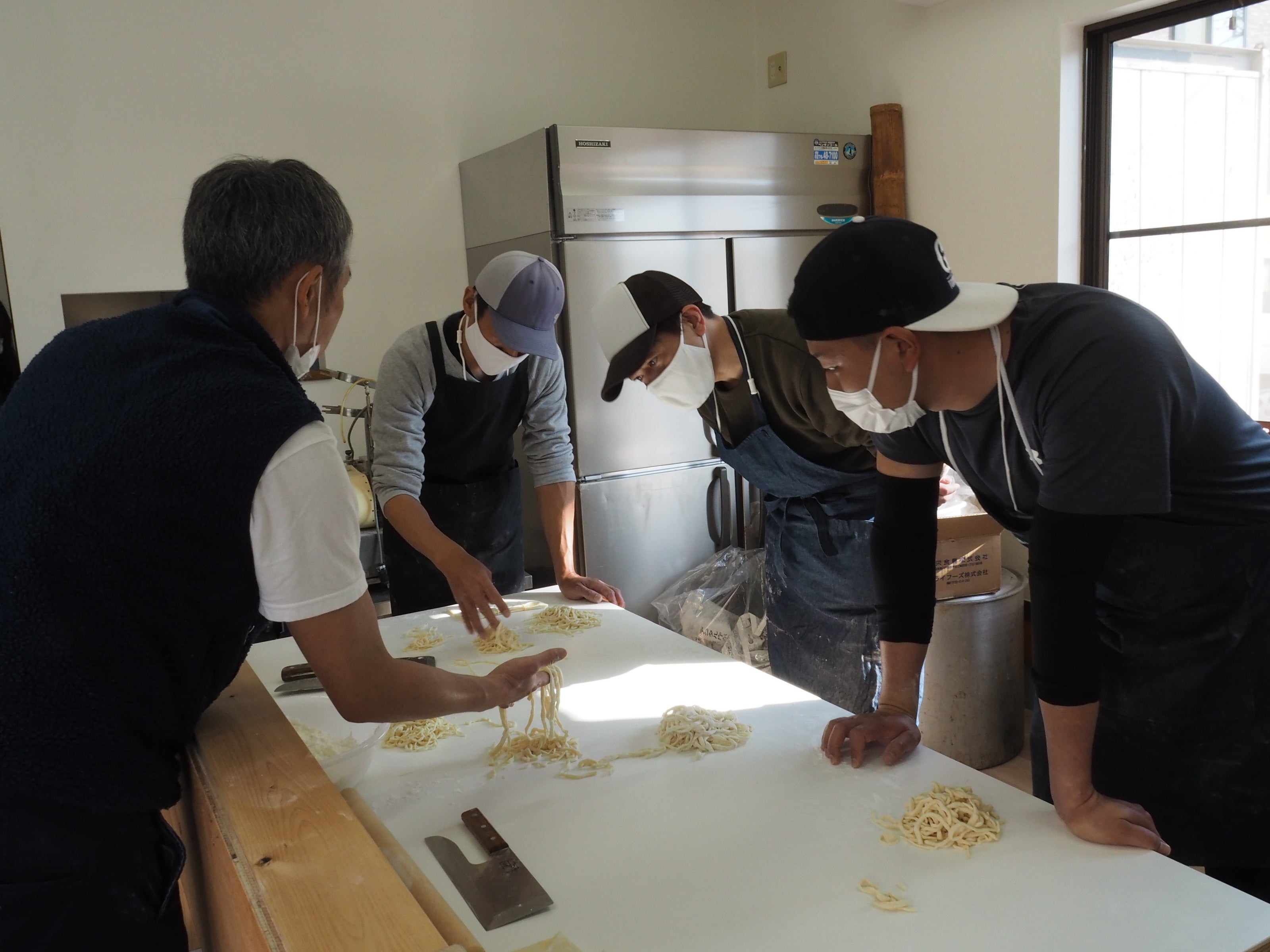 お店の味に近づけるため、佐野らーめんの伝統的な製法「青竹打ち」を現場で!