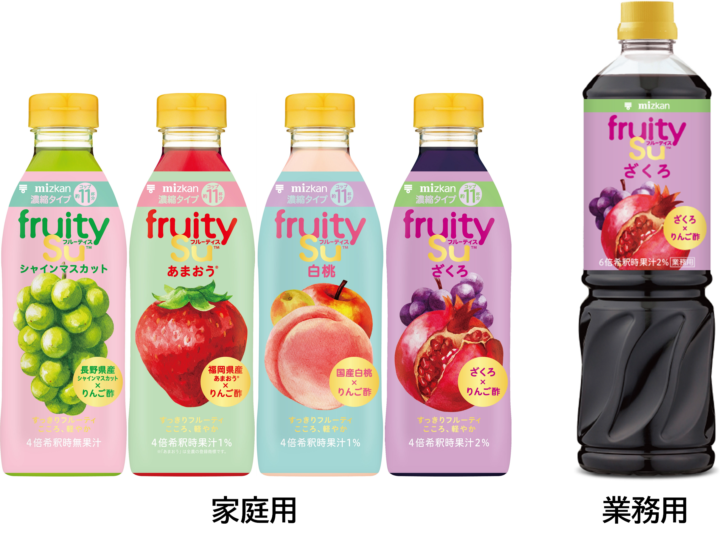 家庭用では、2026年2月18日(水)より「長野県産シャインマスカット」、「福岡県産あまおう」、「国産白桃」、「ざくろ」の全4種(4倍濃縮タイプ)を新発売いたします。