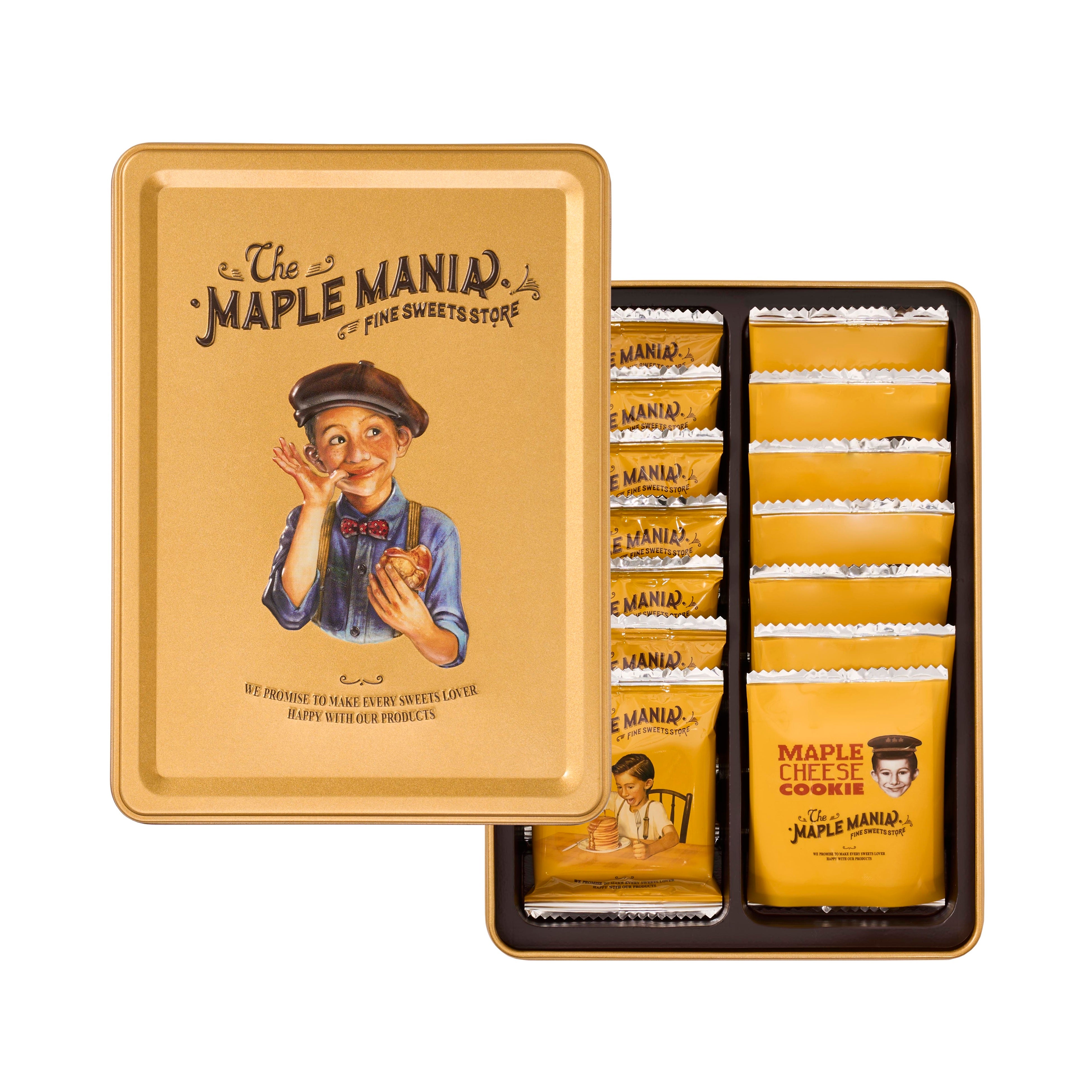 クッキー缶は、存在感のあるゴールドで特別感を演出。指先に触れるエンボス加工の立体感は、手に取るたびに愛着が深まるメープルマニアらしい仕上がりです。