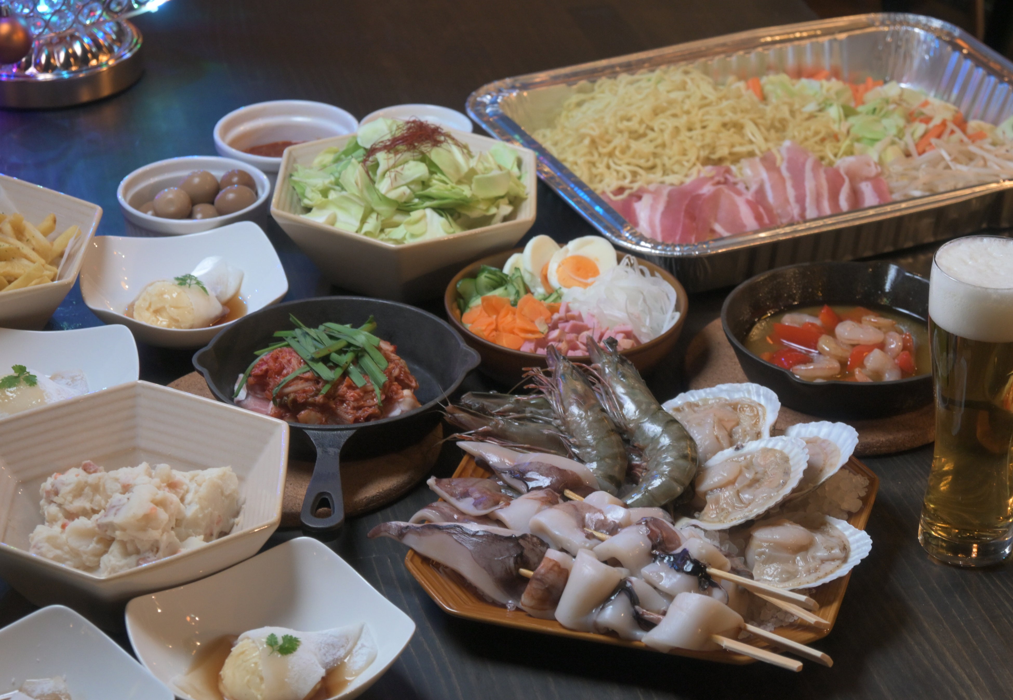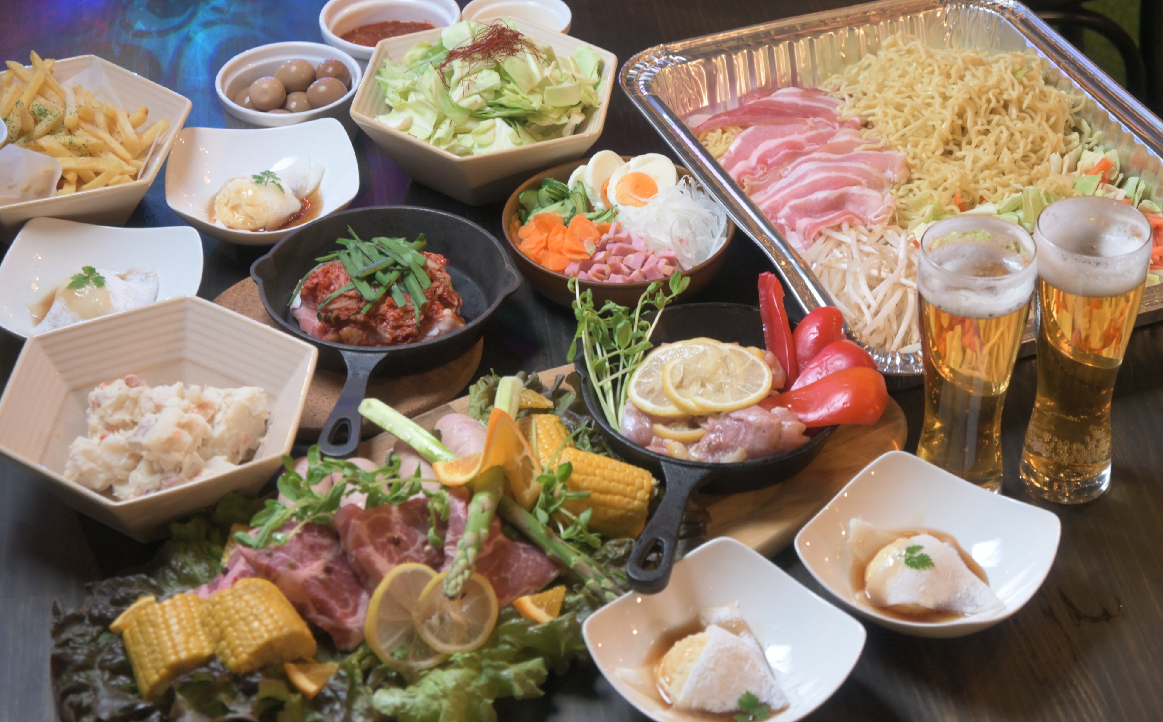 極厚なお肉やジャンボフランクフルトに季節の野菜も豪勢に追加した、本格BBQ寄りの充実コース。居酒屋の気軽さはそのままに、焼きの楽しさ・食べ応えをしっかりプラス!「せっかくならBBQ感も味わいたい」という会にぴったり。