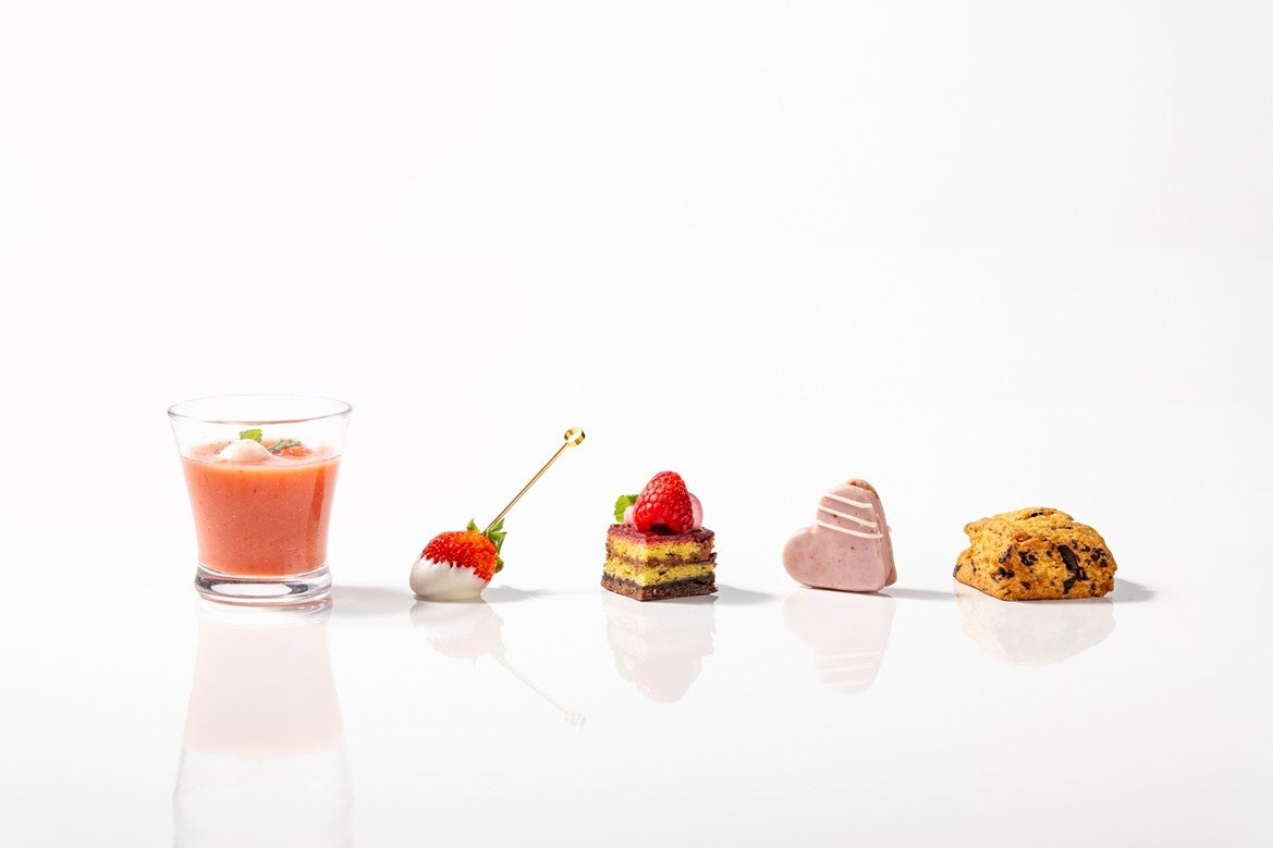 ハートのクッキーサンドやトリュフチョコボール、フレッシュいちごとホワイトチョコレートのマリアージュ、プレゼントボックスを模したスイーツなど、心をほどく可憐なスイーツがラインアップ。ラズベリーとピスタチオのケーキが華やかさを添え、ヨーグルトムースの軽やかな酸味が味わいに奥行きを持たせます。