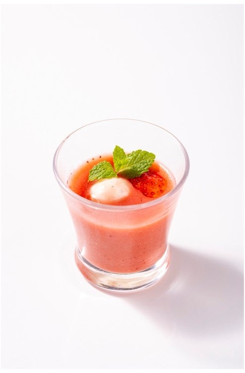 モッツァレラチーズの白とミントの緑をアクセントにした色鮮やかないちごの冷製スープ