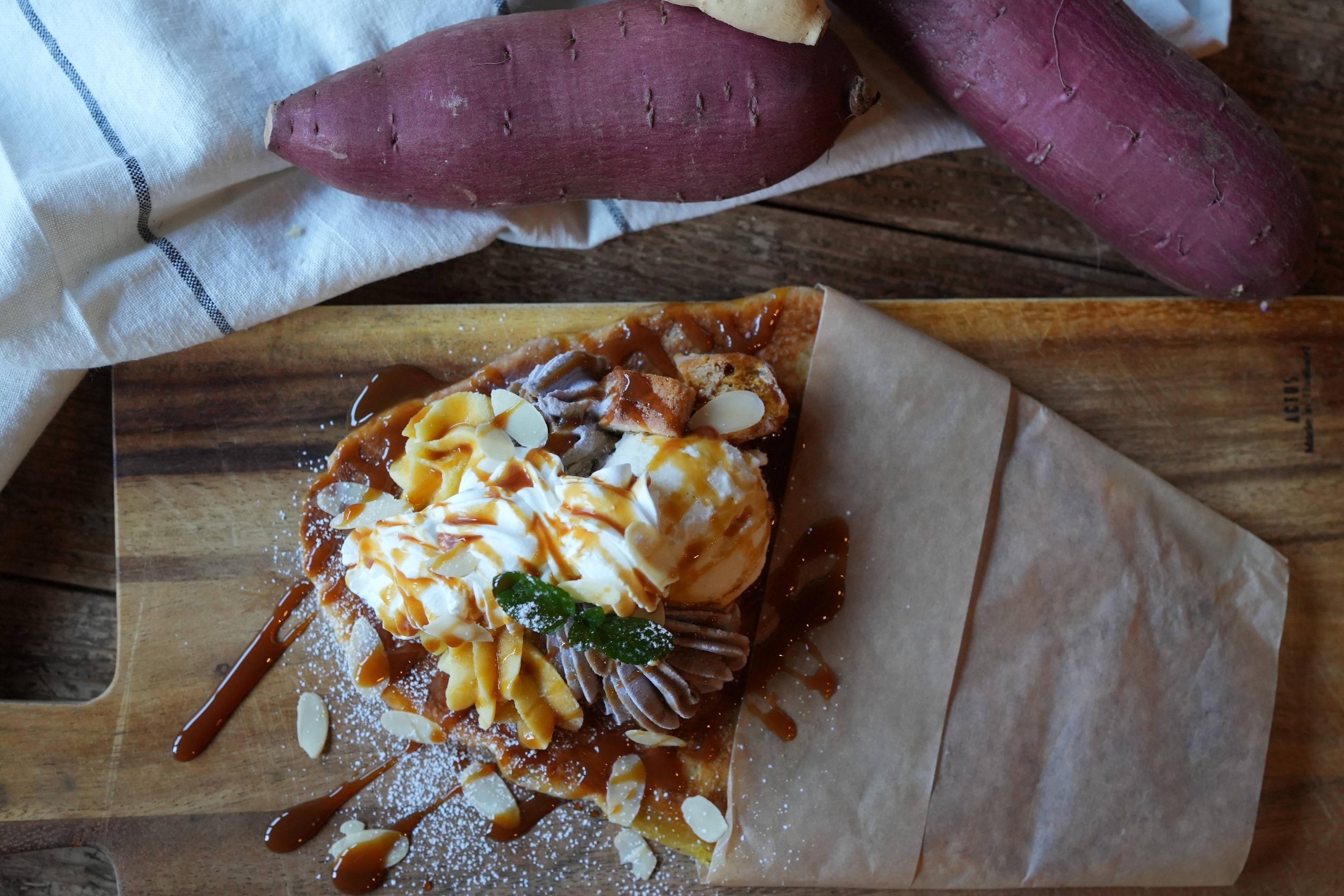 カットした金蜜芋にバニラアイスをのせ仕上げに1mmモンブランを繊細にまとわせました。