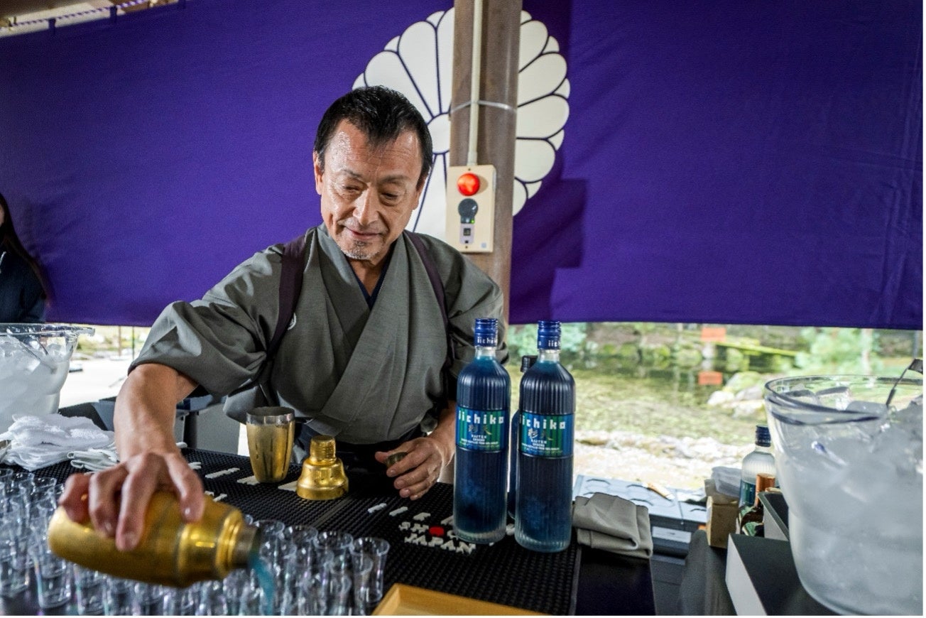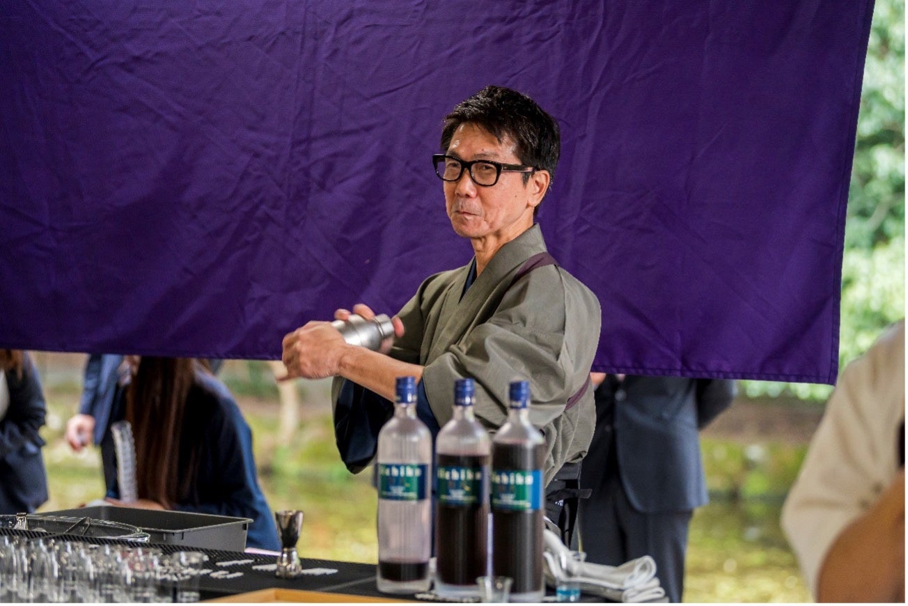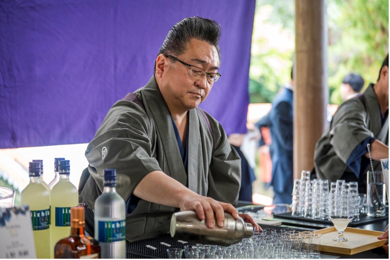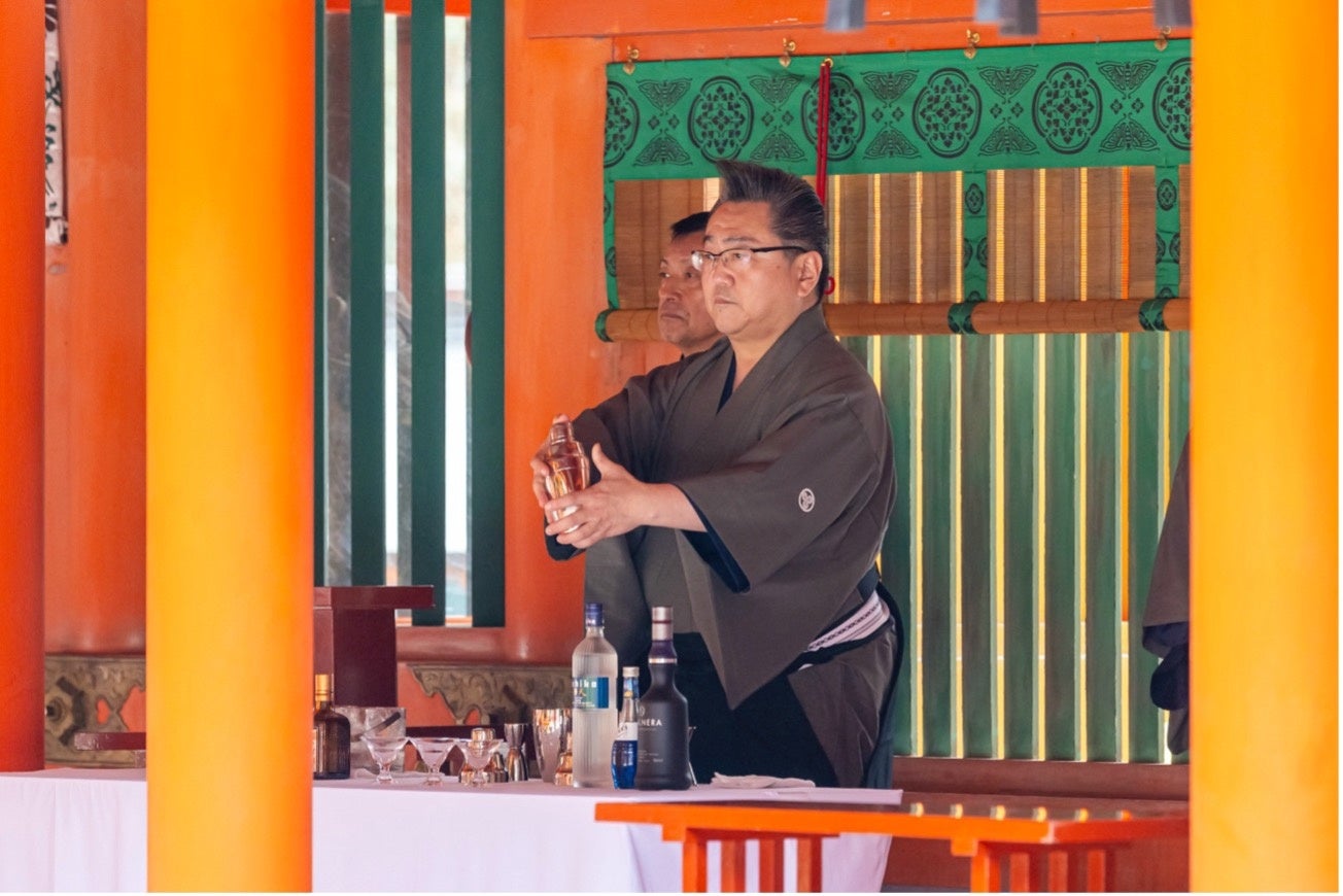 紋付袴でシェーカーを振るう姿は、神域という特別な空間において、世界のカクテル文化と日本の焼酎文化が高い次元で融合する様子を象徴するものとなりました。