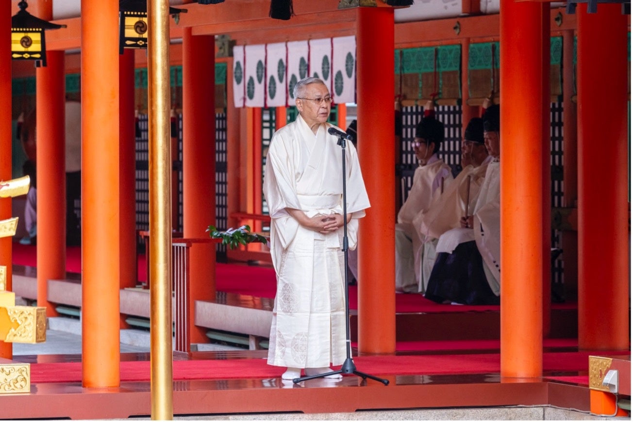 「本年は宇佐神宮において、ご鎮座1300年という極めて重要な節目の年でございます。これまで恒例としてきたお花やお茶の奉納とは異なり、カクテルをご奉納いただくということは、宇佐神宮始まって以来、初のことでございます。この度、バーテンダーの方がシェーカーを振る音が、これほどまでに神々しいものであるのかと、初めて実感させていただきました。本日執り行いました祈願奉納祭をもちまして、『iichiko彩天』がここから世界に向けて発売され、皆様方に深く親しまれるお酒となりますよう、衷心より祈念いたします。」