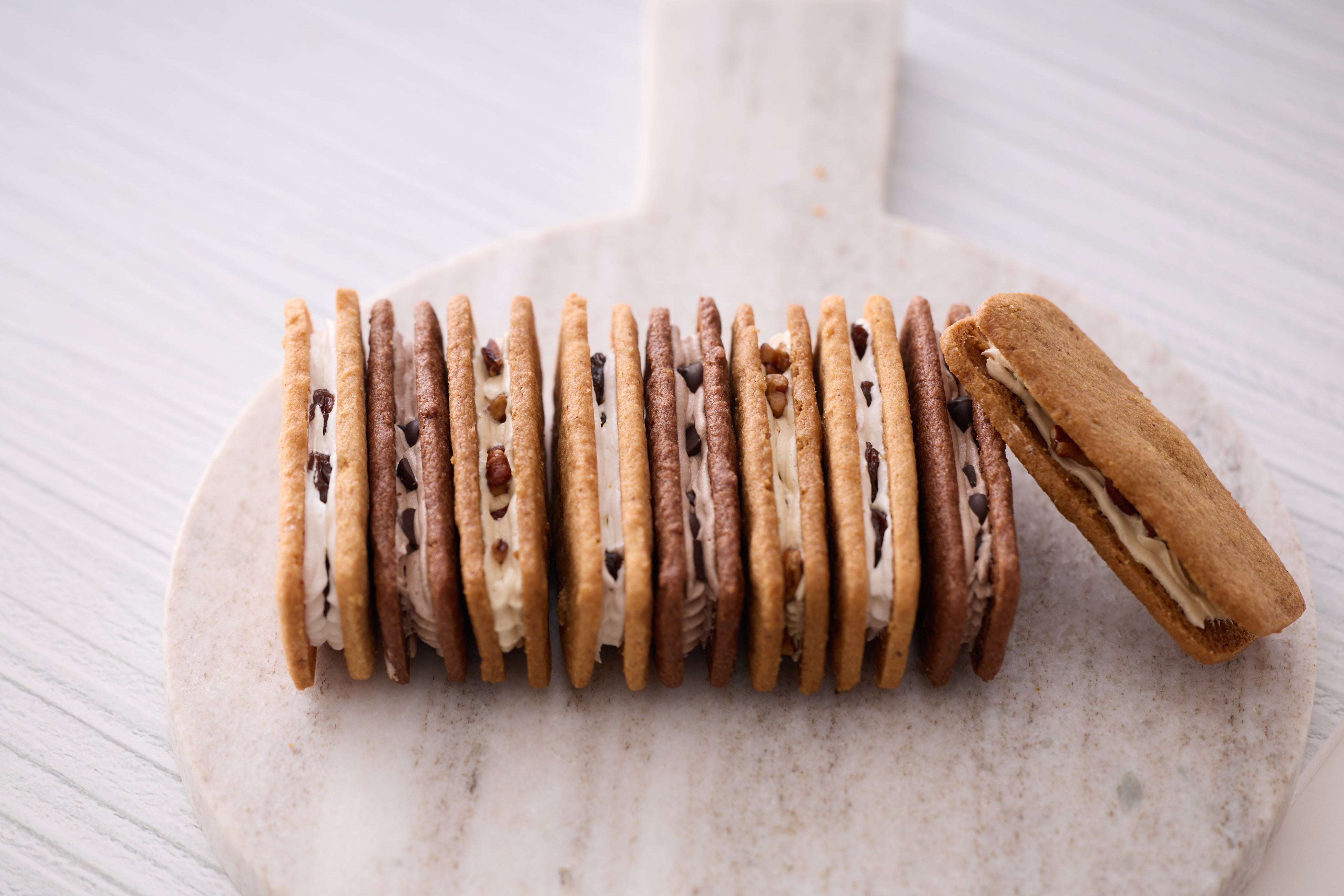 上質なココアパウダーを加えたコクのあるヘーゼルナッツサブレ生地に、くちどけなめらかなショコラクリームとカリッとチョコチップをサンドしました。