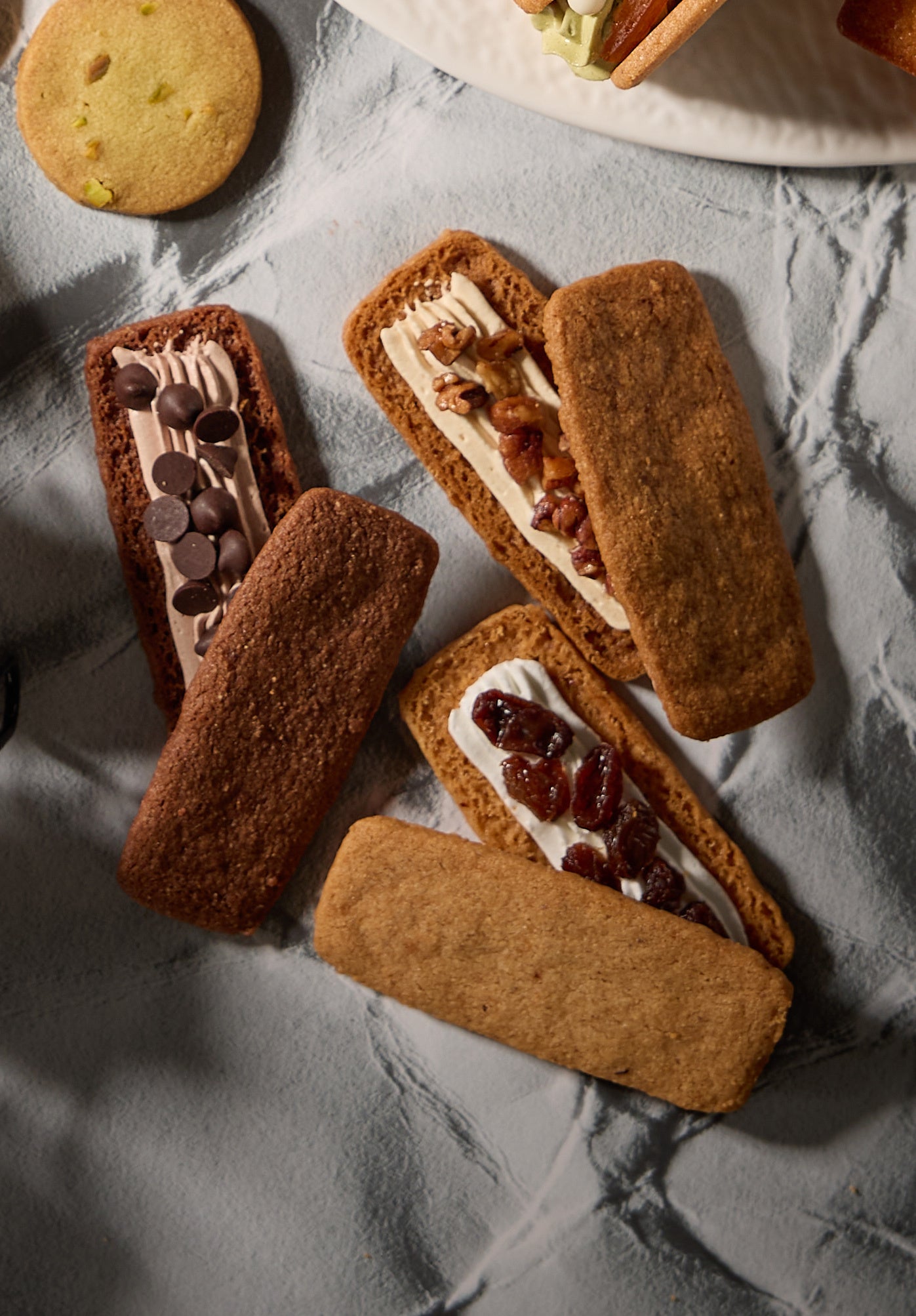 芳醇でコク深いヘーゼルナッツパウダーを練りこんだサブレ生地に、くちどけなめらかなホワイトチョコクリームと、上品な香りと旨味が詰まったラム酒漬けレーズンをサンドしました。