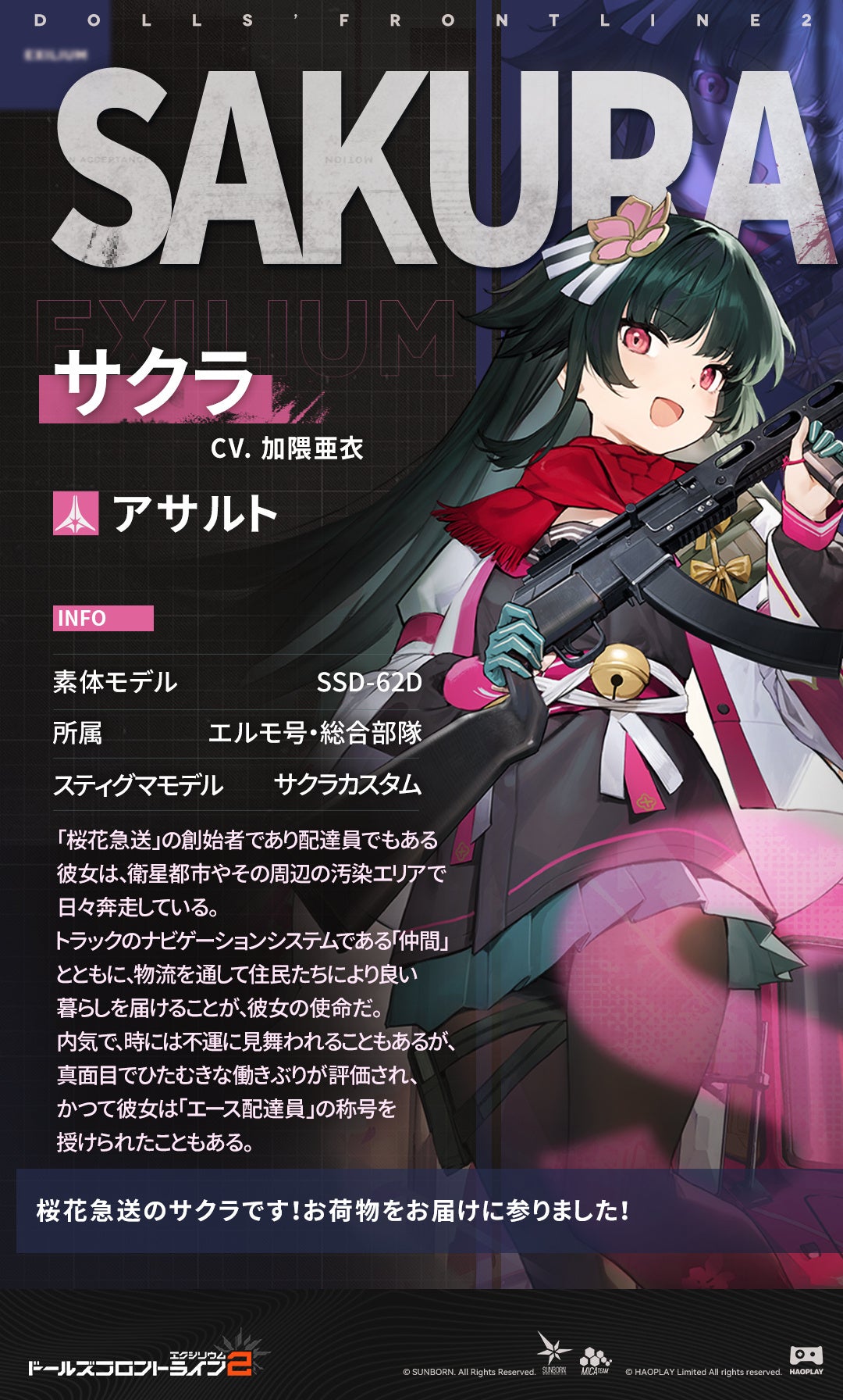 また、「サクラ」に扮したコスプレイヤーの来店や、本イベントへ来場するともらえるポストカード、アンケート回答によりもらえる「ドールズフロントライン2:エクシリム」のキャラクターカードなど、様々な特典も用意しておりますので、ぜひお気軽にお立ち寄りください。