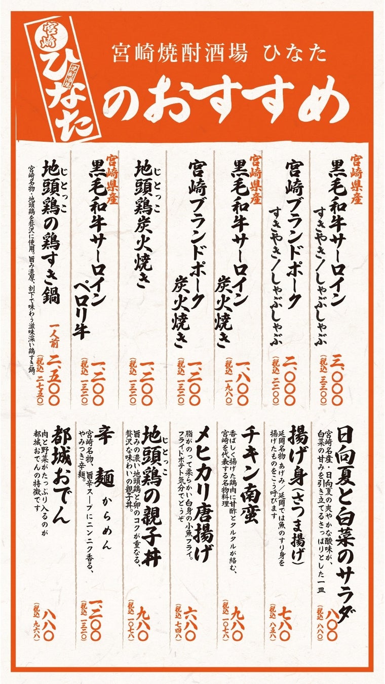 店内では、希少銘柄から定番まで揃う全38蔵の本格焼酎に加え、焼酎の味わいを引き立てる宮崎の名物・特産品をふんだんに使用したメニューを提供します。