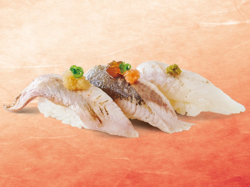 ほっけ炙り(染おろしのせ)/とろにしん炙り(もみじおろしとポン酢ジュレのせ)/八角炙り(柚子こしょうのせ)