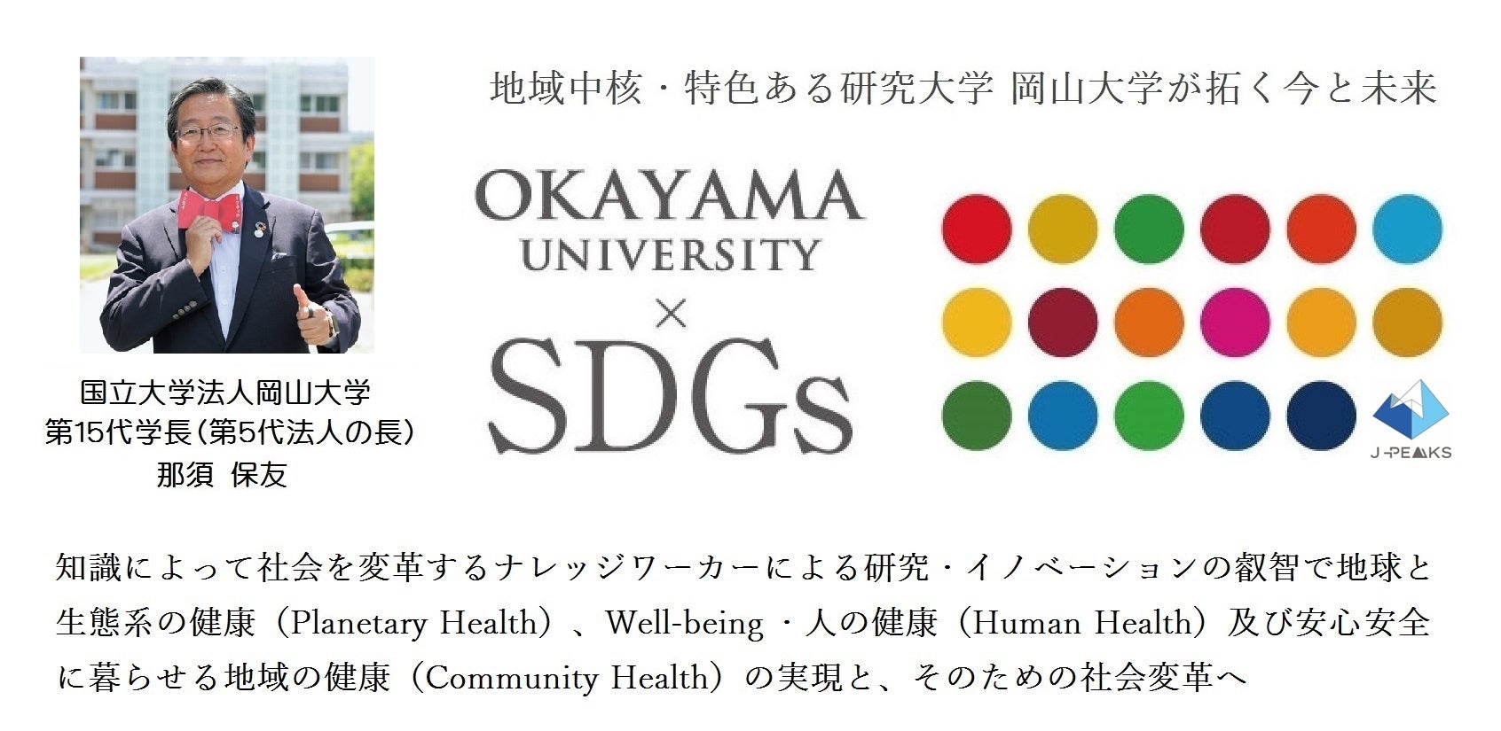 岡山大学 文部科学省「地域中核・特色ある研究大学強化促進事業(J-PEAKS)」に採択~地域と地球の未来を共創し、世界の革新の中核となる研究大学:岡山大学の実現を加速とともに世界に誇れる我が国の研究大学の山脈を築く~