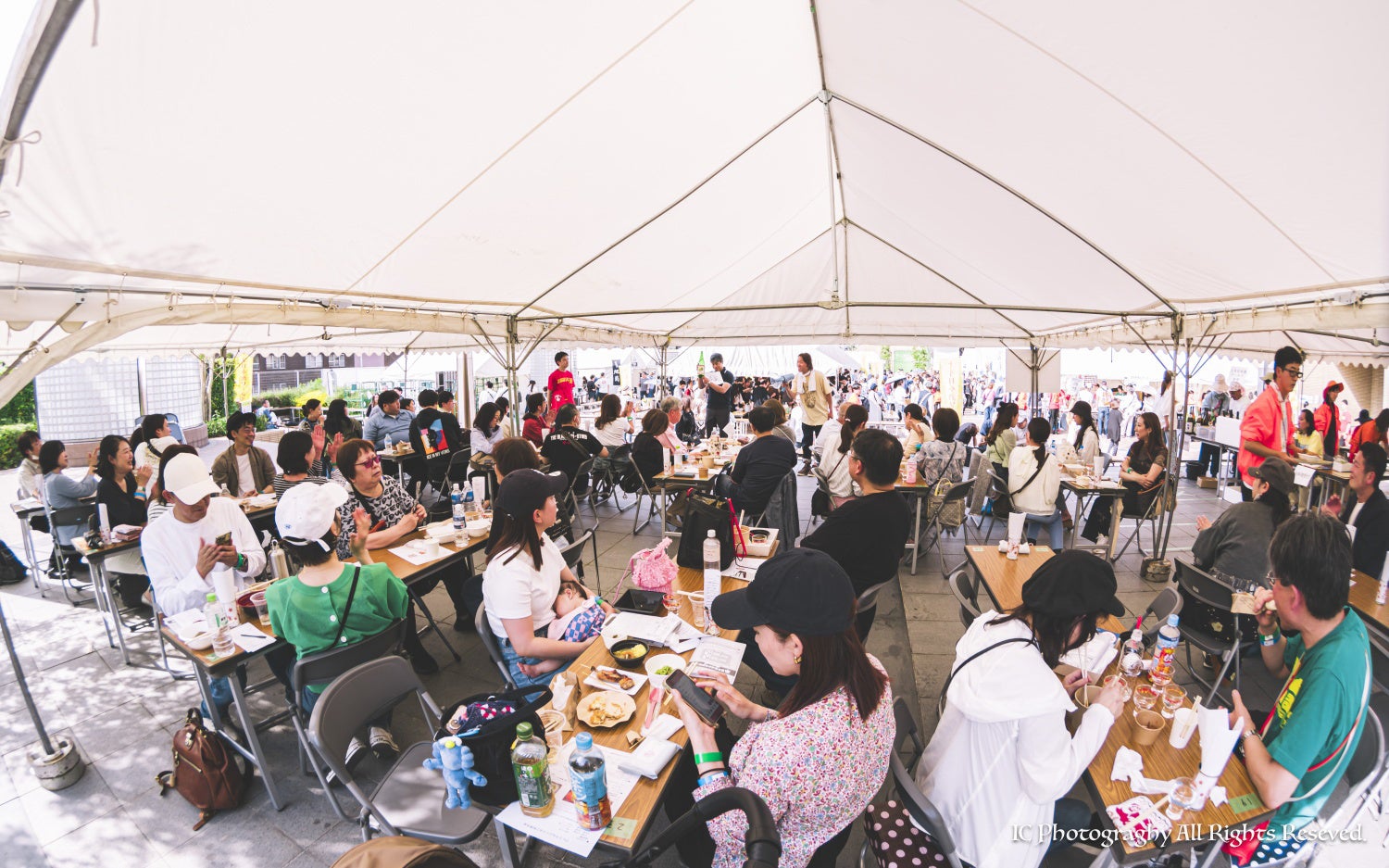 全天候型で快適:天候に左右されないテント内で、ゆったりと食事をお楽しみいただけます。