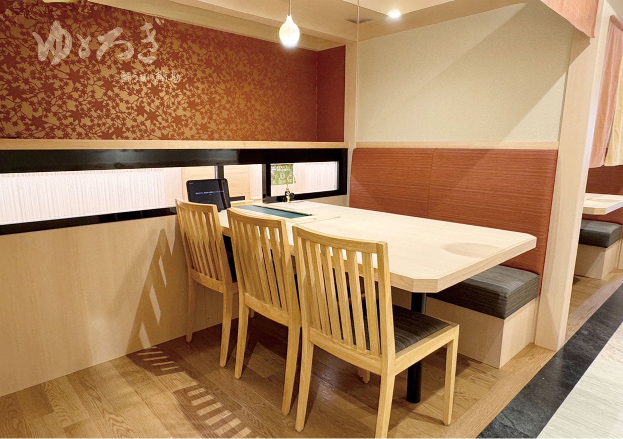 うまい鮨勘 ゆとろぎは、「ゆっくりくつろげる空間」をコンセプトにした、暖簾(のれん)で仕切られる半個室の新しい回転寿司。 レーンで運ばれてきた商品は、ベルトコンベアでテーブル中央に押し出される斬新な配膳システム。さらにタッチパネルオーダーで、お食事中の会話も途切れることがありません。