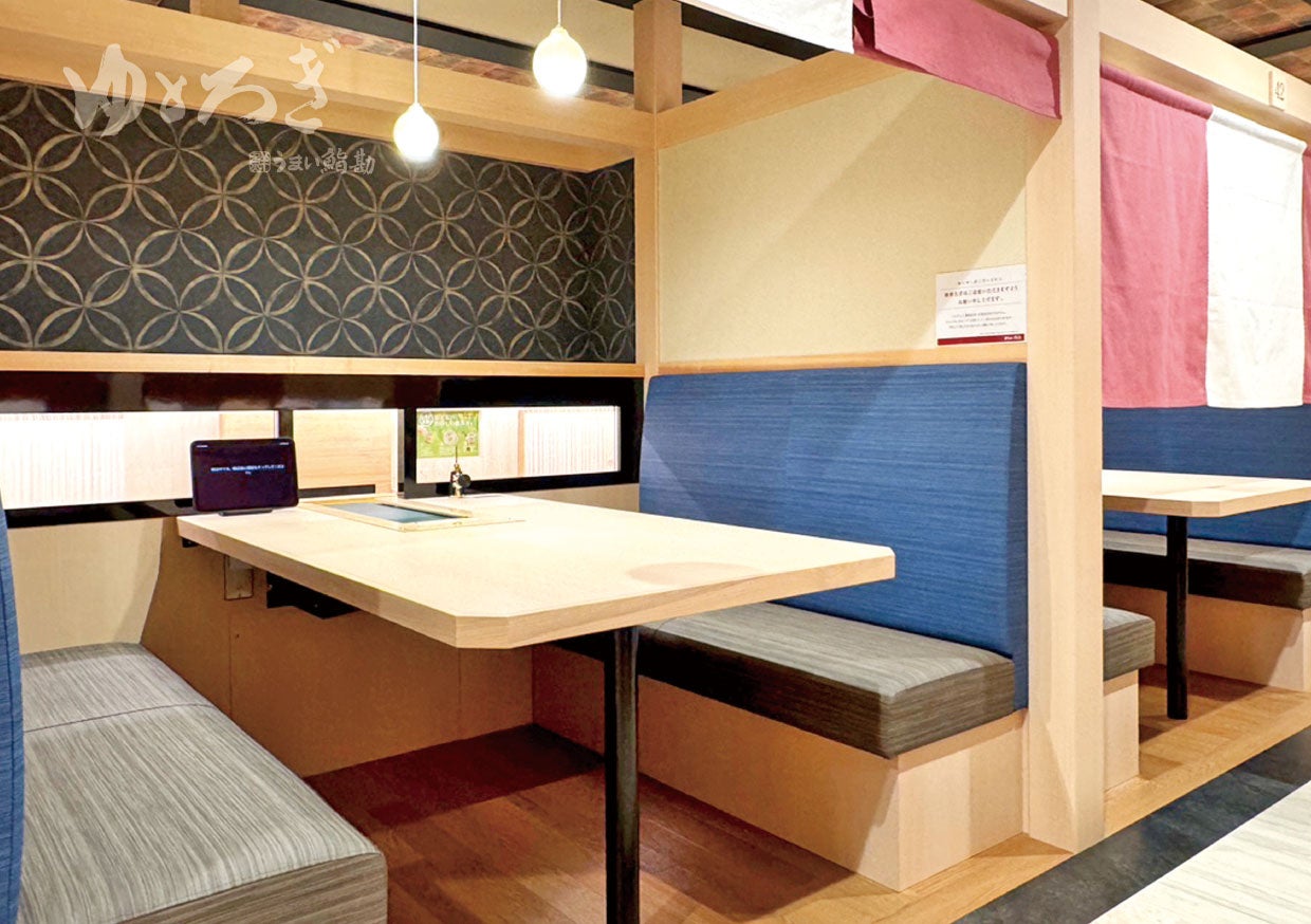うまい鮨勘 ゆとろぎは、「ゆっくりくつろげる空間」をコンセプトにした、暖簾(のれん)で仕切られる半個室の新しい回転寿司。 レーンで運ばれてきた商品は、ベルトコンベアでテーブル中央に押し出される斬新な配膳システム。さらにタッチパネルオーダーで、お食事中の会話も途切れることがありません。