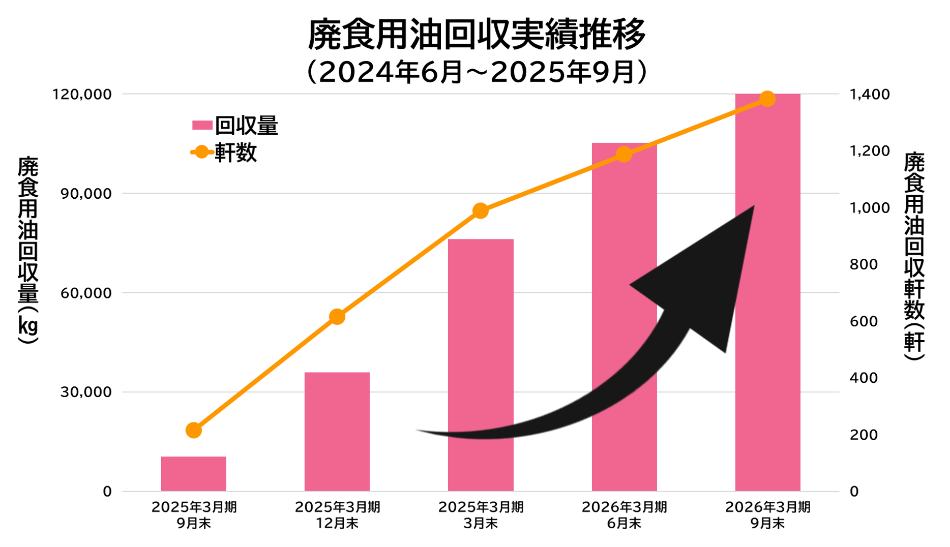 2024年6月より、首都圏・関西・九州の営業エリアで同サービスを開始し、多くの飲食店様にご利用いただいております。この取り組みにより、2025年9月末での累計回収量は300トンを超え、ご依頼軒数は1,400軒に達しました。