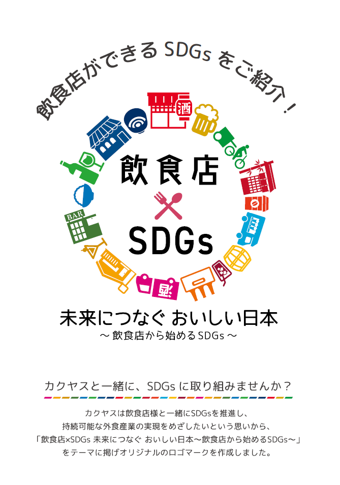 当社グループでは、『飲食店×SDGs』オリジナルロゴマークを制作し、飲食店の皆さまと共にSDGsの推進に取り組んでいます。廃食用油回収をはじめ、取り組みやすいSDGs活動をご提案し、ご賛同いただいた飲食店様にはステッカー等を配布しています。また、飲食店が実践できるSDGsを紹介する冊子もご用意しております。