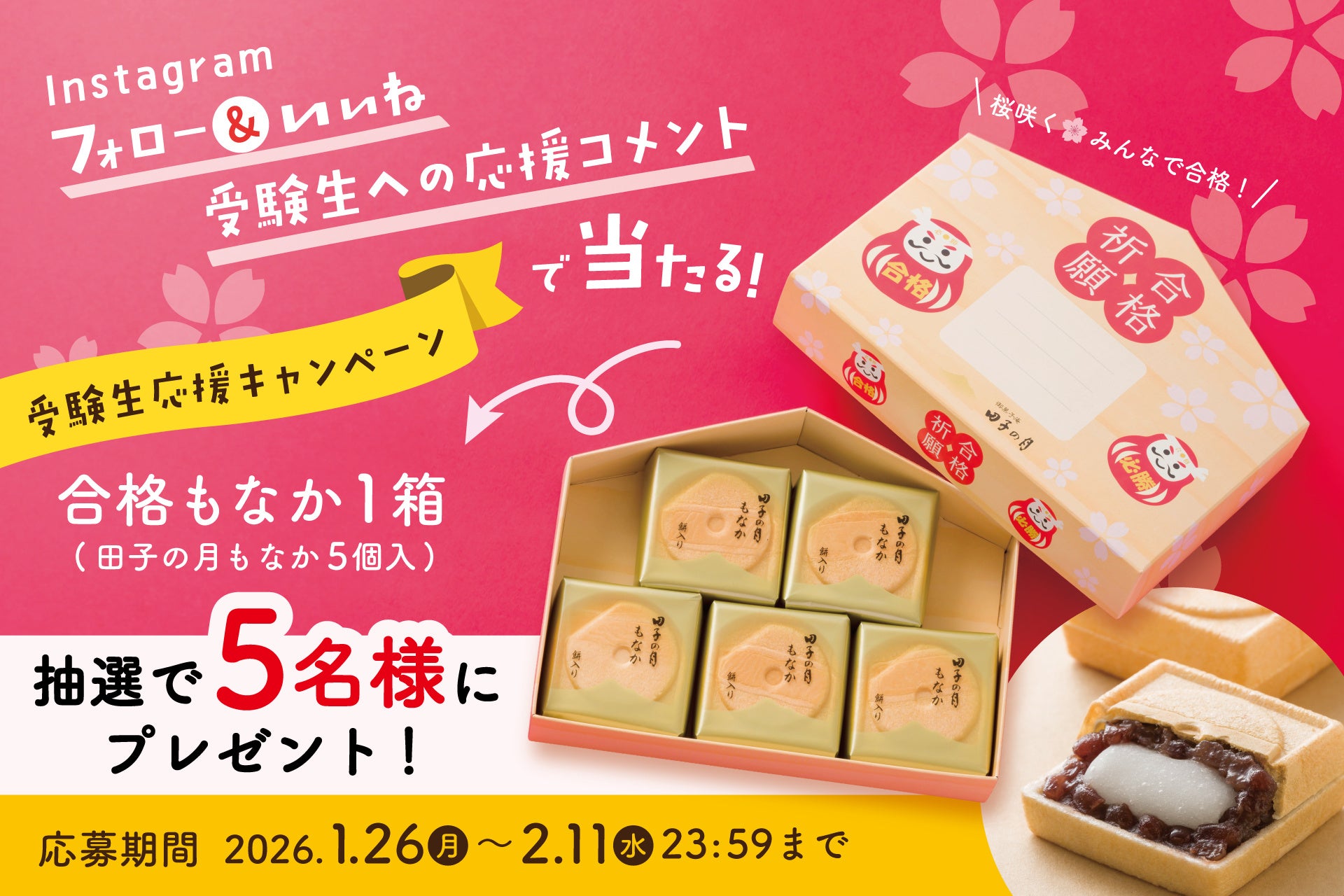 株式会社 田子の月(本社:静岡県富士市今泉380-1、代表取締役社長:牧田 桂輔)は、受験シーズン真っ只中の今、頑張っている受験生を応援したいという気持ちを込めて、Instagramフォロー&いいね&受験生への応援コメントで「合格もなか」が5名様に当たる、受験生応援キャンペーンを本日より開始いたしました。