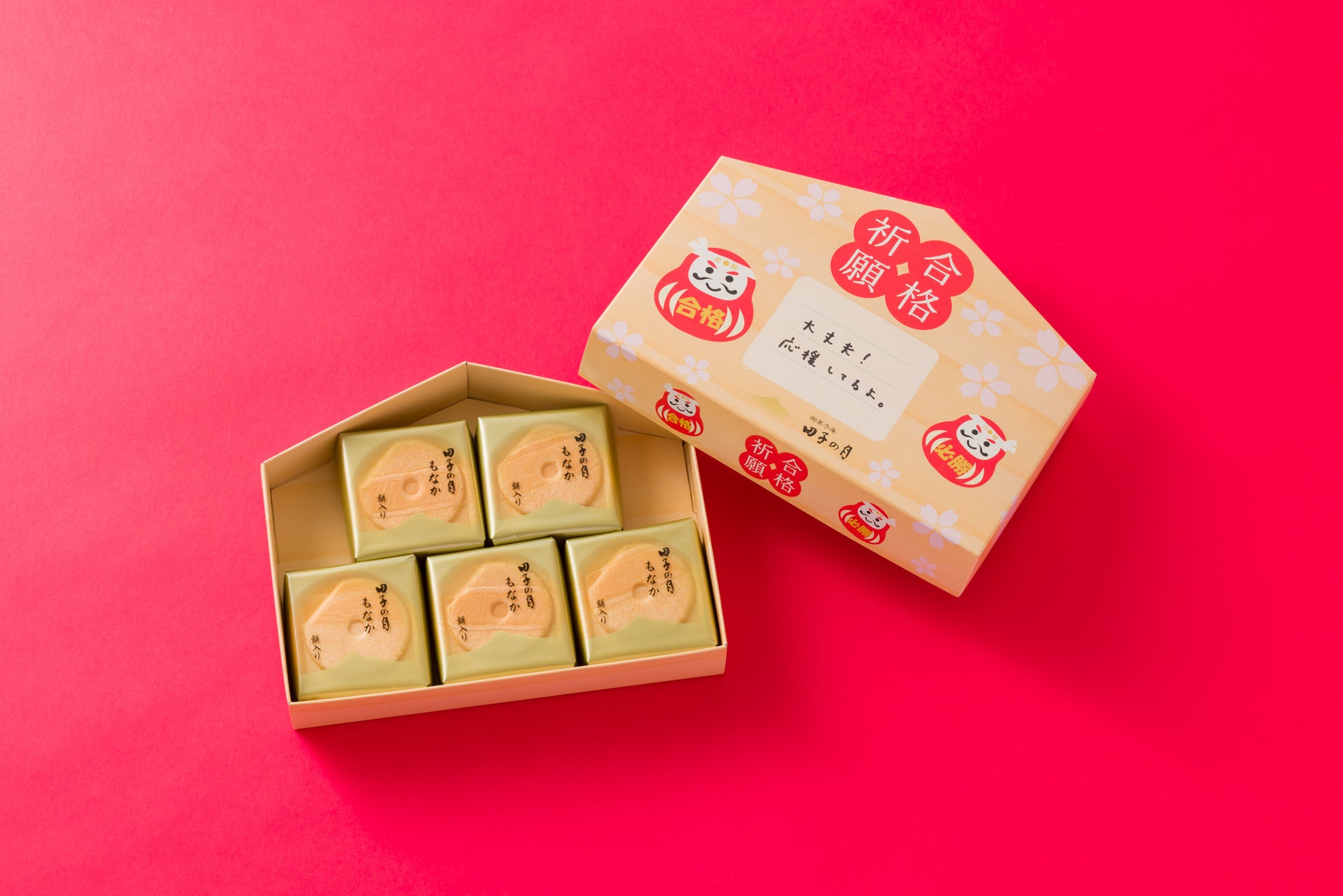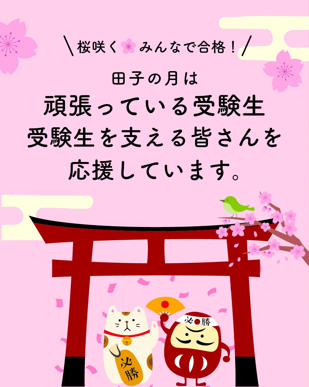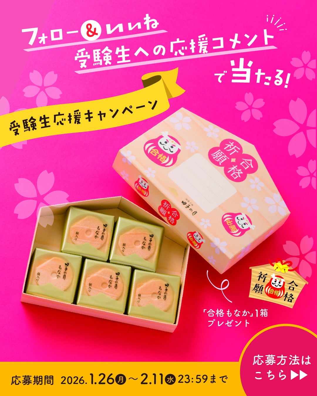 本日から開催の受験生応援キャンペーンでは、弊社の看板商品「田子の月もなか」が5個、合格祈願絵馬の形をした箱に入った「合格もなか」を5名様(合格にかけて、5名様)にプレゼントいたします。『桜咲く みんなで合格!』を目指して、受験生を応援する気持ちを込めて、ぜひキャンペーンへのご応募、お待ちしております。