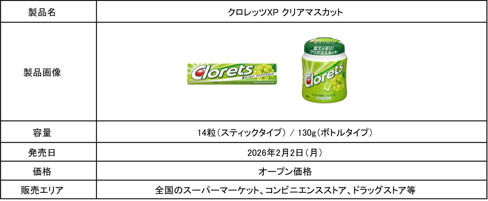 「クロレッツ」ならではのスッキリとした清涼感と、人気のマスカットフレーバーを掛け合わせることで、日常のリフレッシュシーンはもちろん、気分を切り替えたいときにもぴったりなフレーバーとして発売が決定しました。