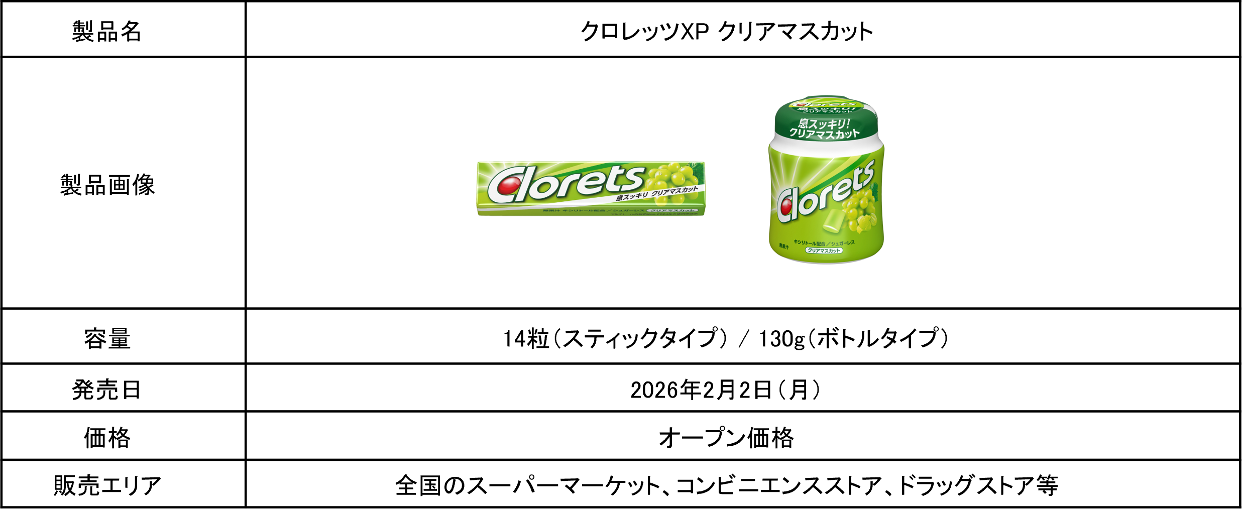 「クロレッツ」ならではのスッキリとした清涼感と、人気のマスカットフレーバーを掛け合わせることで、日常のリフレッシュシーンはもちろん、気分を切り替えたいときにもぴったりなフレーバーとして発売が決定しました。