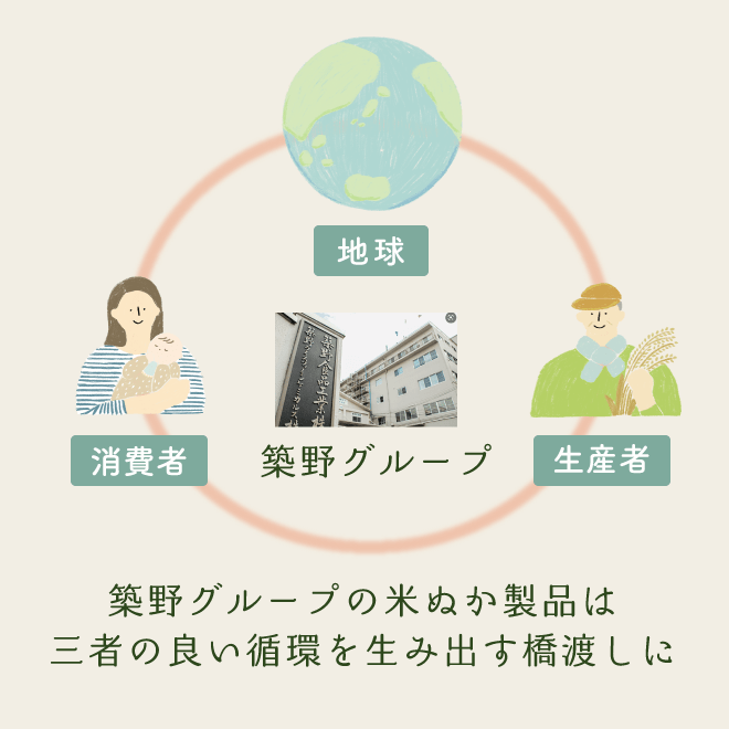 築野食品工業は長年、こめ油の原料である米ぬかの成分に着目し、研究を進めてまいりました。精米時に発生する副産物である米ぬかの成分を抽出することで、こめ油だけでなく食品、化学、医療、化粧品等の幅広い分野への高度有効利用をし、米ぬかの100%活用をしています。今後も国内の米ぬかを活用することで地球・生産者・消費者の良い循環の実現を目指していきたいと考えています。