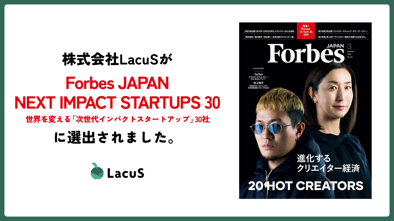 株式会社LacuS(本社:新潟市中央区紫竹山6-3-5、代表取締役:古津瑛陸)は、経済誌『Forbes JAPAN』が投資家・起業家・業界関係者へのアンケート取材を経て発表した「世界を変える次世代インパクトスタートアップ30社」に選出されたことをお知らせいたします。