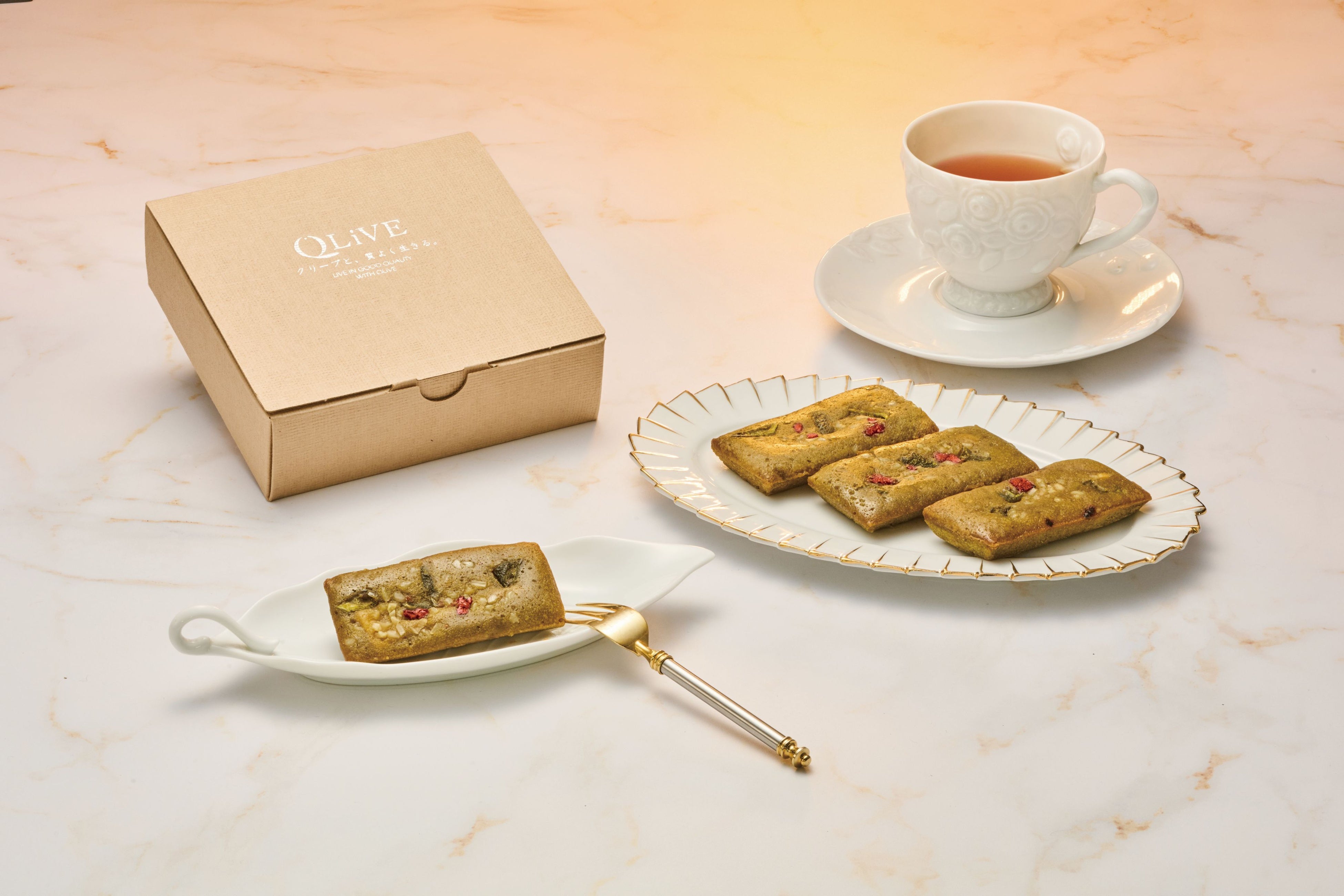 フィナンシェの中にはオリーブと相性抜群の甘酸っぱいキャラメルチーズクリームが入り、一口ごとに新しい発見ができる味わいです。