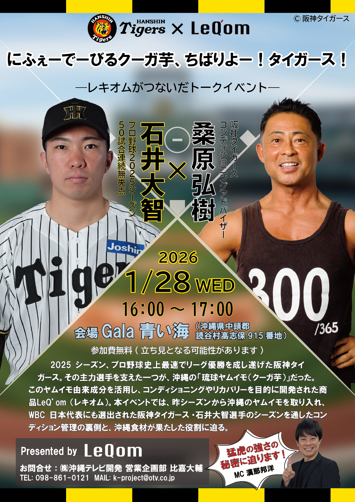 沖縄在来山芋”クーガ芋(別名:琉球ヤムイモ)”を活用した商品「LeQ’om(レキオム)」の研究開発・販売をおこなう株式会社沖縄テレビ開発(沖縄県那覇市、代表取締役社長:大田直也)は、連続無失点の世界記録を更新し、WBC2026に選出された阪神タイガース石井大智選手を沖縄に迎え、沖縄食材がトップアスリートのコンディショニングを支えた実例を語るトークイベントを開催いたします。