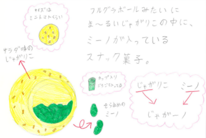 ・受賞者(宇都宮市立峰小学校 小久保朋香さん)のコメント: 私の好きなお菓子の中から、「じゃがりこ」と「ミーノ」を組み合わせると楽しそうだと思いました。まさか、私の作品が選ばれると思っていなかったので、受賞できてとてもうれしいです。