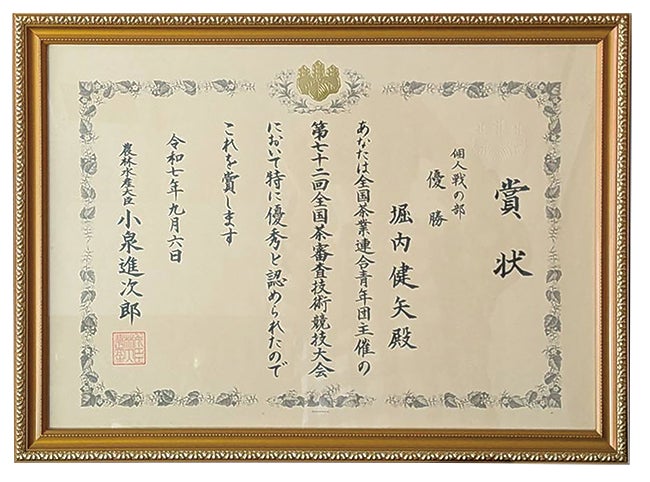 東京都江東区で開催された「第72回全国茶審査技術競技大会」において、製茶問屋・丸堀製茶株式会社(本社:静岡県掛川市、代表:堀内尚)の堀内健矢が個人戦で優勝し、日本一の栄誉である農林水産大臣賞を受賞しました。