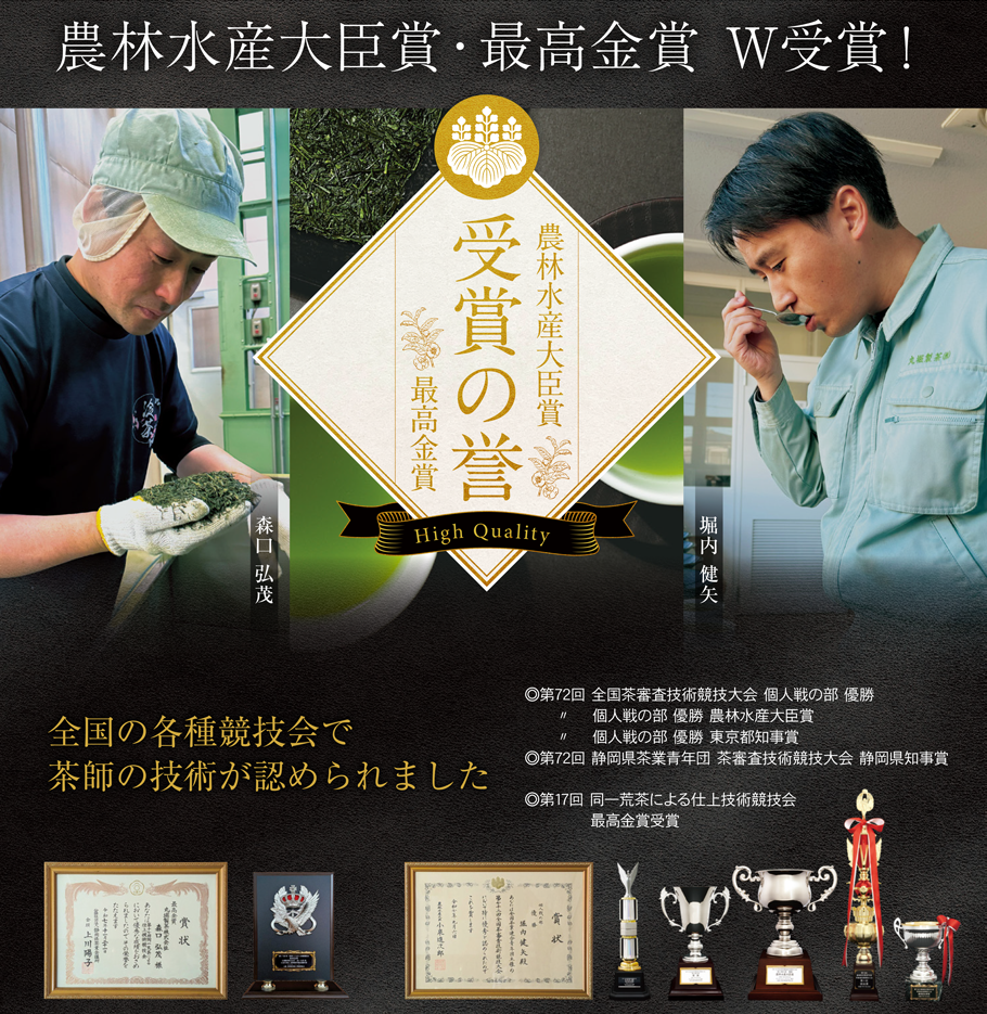 この度、農林水産大臣賞を受賞した堀内が原料を厳選し、合組(原料茶葉のブレンド)を行い、さらに昨年「同一荒茶による仕上げ技術競技大会」で最高金賞を受賞した同社森口弘茂が妥協のない仕上げ加工を行いました。