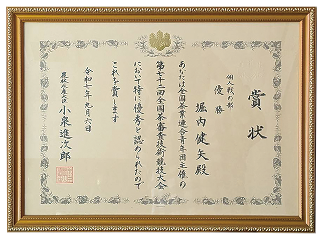 同大会の予選として位置づけられる静岡県大会においても優勝を果たした堀内は、1961年以来の二冠を達成。日々、品質本位でお茶づくりを続けてきた姿勢が結果として現れました。