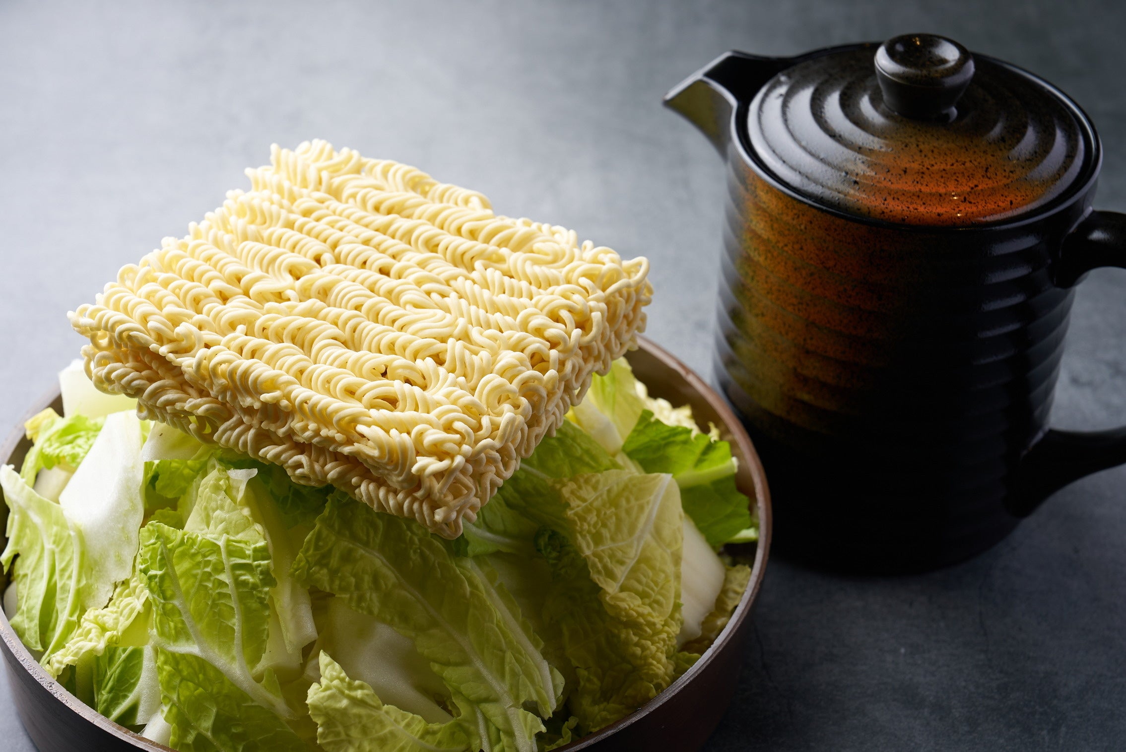 白菜鍋の具材の上に、調理前のチャンポンめんをのせて提供するメニューです。白菜の水分と鍋の旨みを生かしながら、チャンポンめんを一緒に煮込むことで、麺に鍋の味わいがなじむ仕立てとなっています。家庭ではあまり見られない提供スタイルも特徴のひとつです。