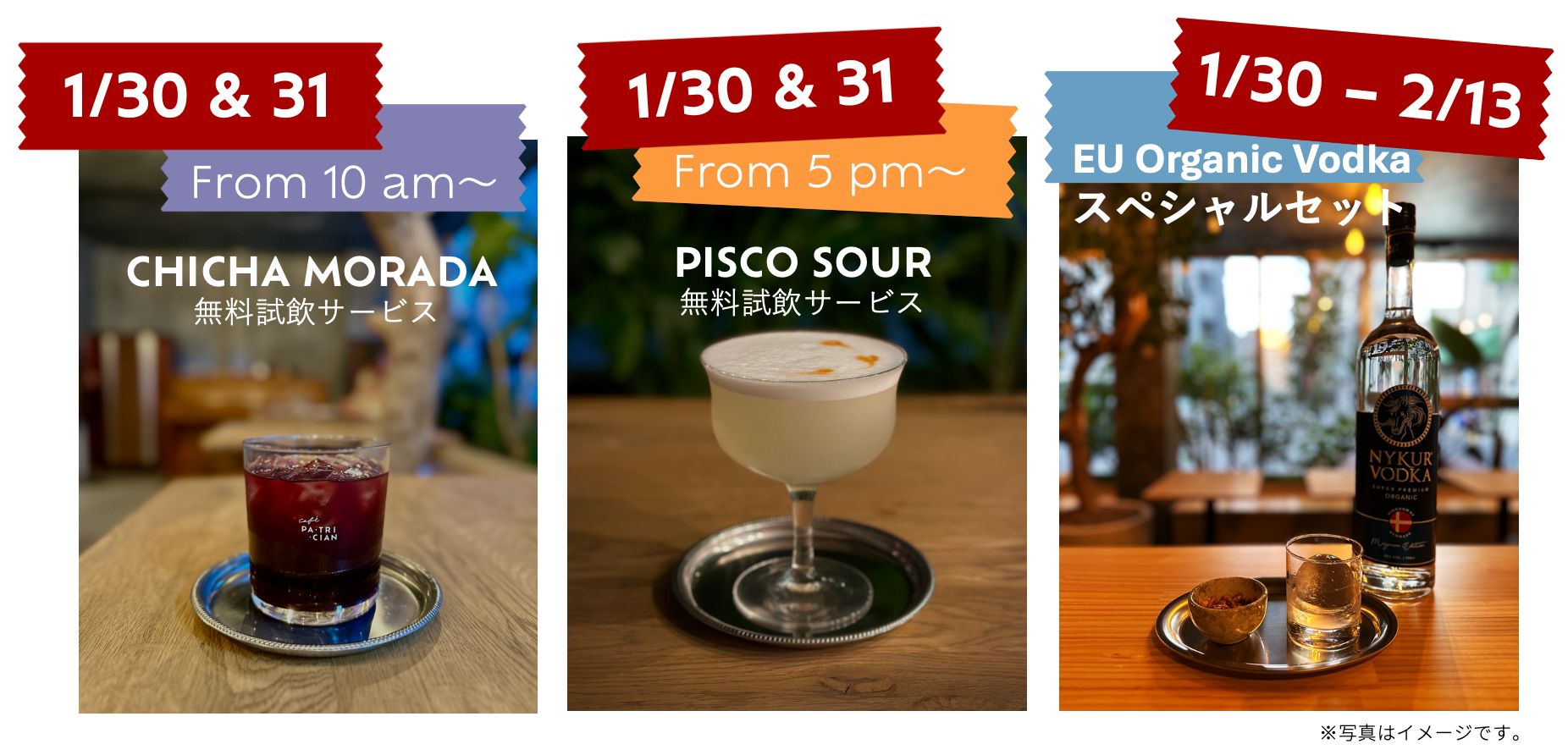 期間中、新商品として導入するペルーの紫トウモロコシを果物やスパイスで煮出したソフトドリンク「チチャ・モラーダ」や、同じくペルーを代表するカクテル「ピスコサワー」の無料試飲を行うほか、EUオーガニック認証を受けた北欧のウォッカとコーンスナックのセットをスペシャル価格(税込1.100円)にて提供いたします。また、SNSフォロワー限定特典として、飲み物を注文した方にアニバーサリークッキーの提供なども予定しています。