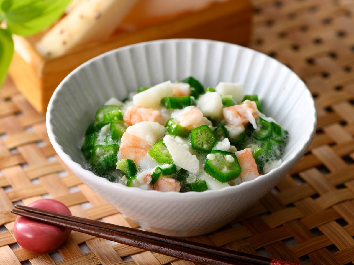 青森県産たたき長芋と海老とおくらの甘酢和え