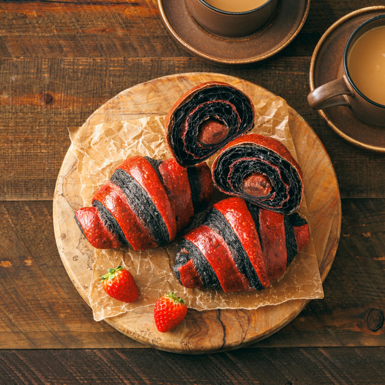 赤と黒の深みのある色合いの生地で、あまおう苺あんとチョコを包んだあんクロワッサンです。チョコの甘みに、あまおう苺あんのほのかな酸味が加わり、さっぱりとした後味を楽しめます。