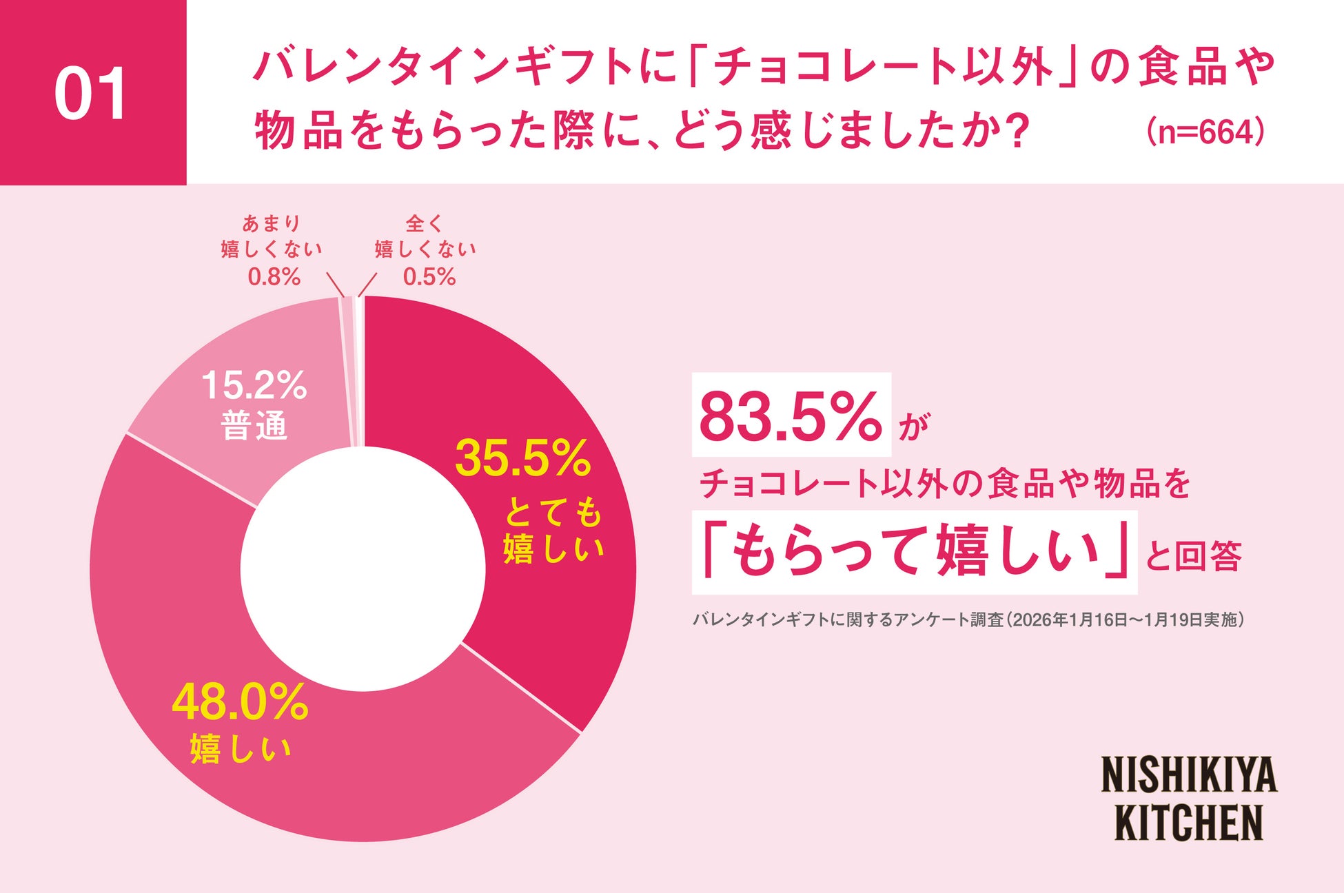 「世界の料理を『カンタン』に。」をコンセプトに掲げ、レトルトカレーを中心に約120種類のレトルト食品を販売する専門店NISHIKIYA KITCHEN(ニシキヤキッチン)(株式会社にしき食品 本社:宮城県岩沼市、代表取締役社長:菊池洋一)は、インターネットリサーチで20〜50代の男女664人を対象に「バレンタインギフト」に関する調査を実施しました。その結果「チョコレート以外の食品や物品ももらって嬉しい」という考えを持つ人が全体の83.5%*にのぼり、バレンタインギフトは「脱チョコレート」時代へ突入したことが判明しました。チョコレート一択のイメージがあるバレンタインですが、近年の健康志向の高まりや選択肢のマンネリ化により価値観が変化し、ギフトの選択肢が広がり、より自由なものへと変化していると考えます。