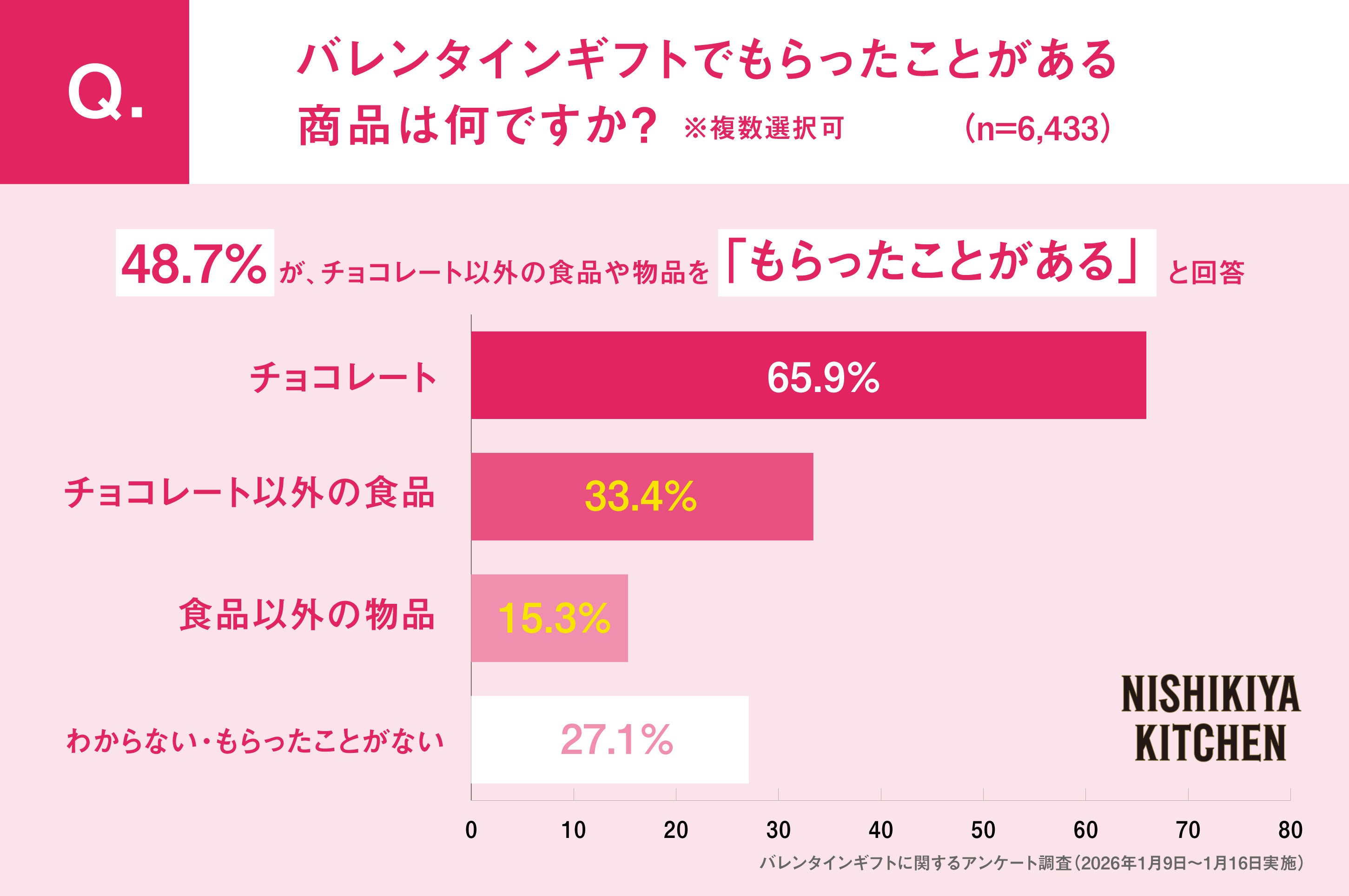 ニシキヤキッチンが2026年1月に実施した調査では「バレンタインギフトでもらったことがある商品は何ですか?」という問いに対し、約48.7%がチョコレート以外の食品や物品を「もらったことがある」と答えました。