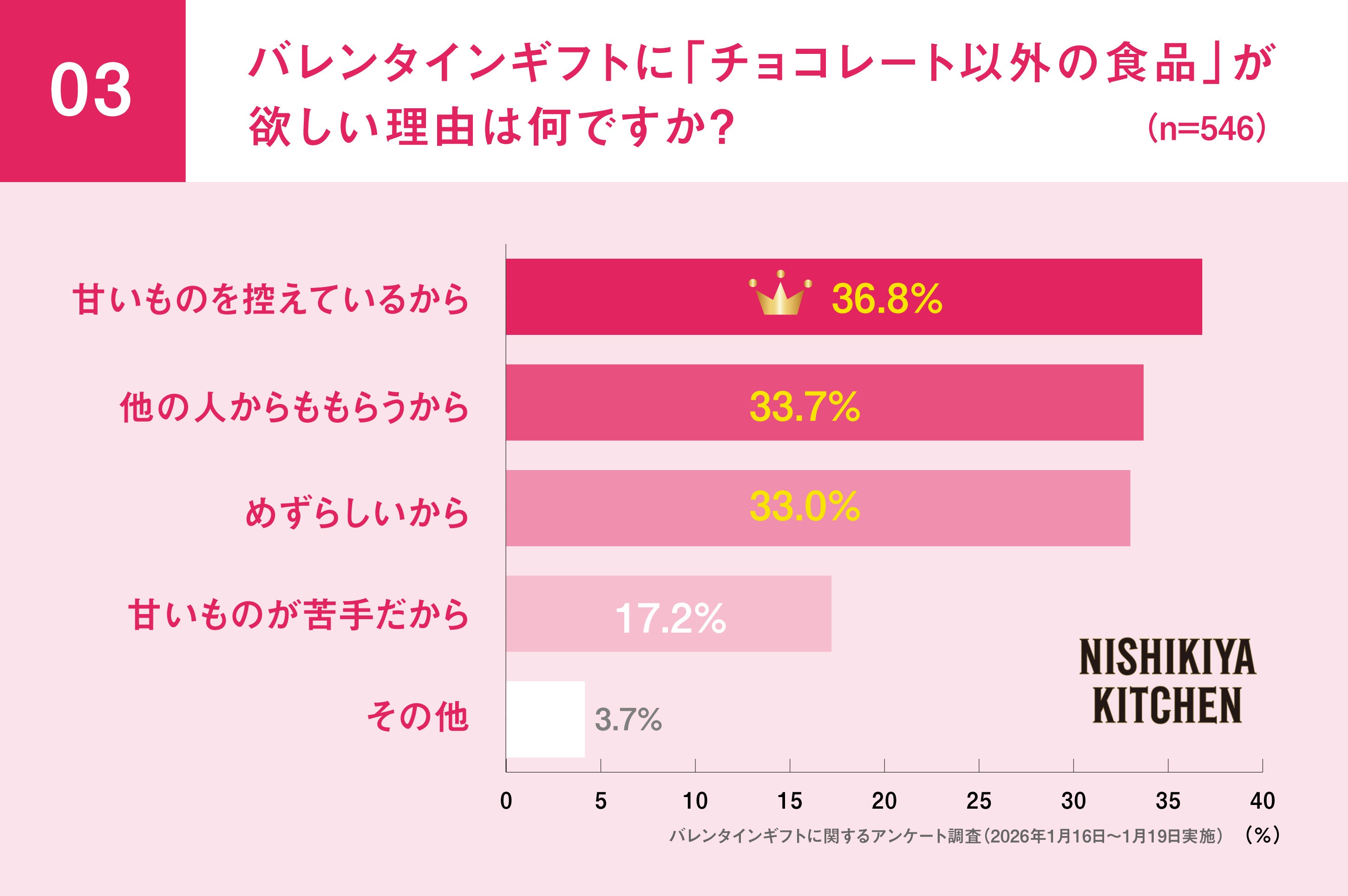 3) バレンタインギフトにチョコレート以外の食品が欲しい理由は「甘いものを控えているから」が36.8%