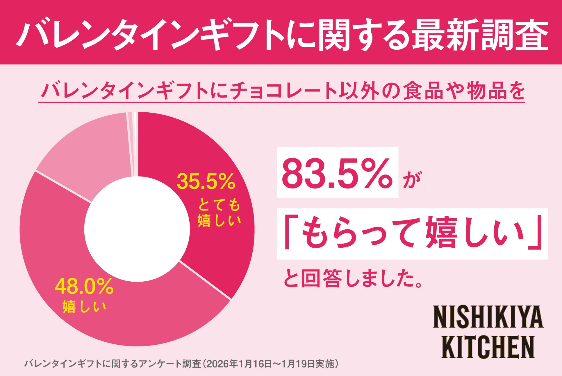 「世界の料理を『カンタン』に。」をコンセプトに掲げ、レトルトカレーを中心に約120種類のレトルト食品を販売する専門店NISHIKIYA KITCHEN(ニシキヤキッチン)(株式会社にしき食品 本社:宮城県岩沼市、代表取締役社長:菊池洋一)は、インターネットリサーチで20〜50代の男女664人を対象に「バレンタインギフト」に関する調査を実施しました。その結果「チョコレート以外の食品や物品ももらって嬉しい」という考えを持つ人が全体の83.5%*にのぼり、バレンタインギフトは「脱チョコレート」時代へ突入したことが判明しました。チョコレート一択のイメージがあるバレンタインですが、近年の健康志向の高まりや選択肢のマンネリ化により価値観が変化し、ギフトの選択肢が広がり、より自由なものへと変化していると考えます。