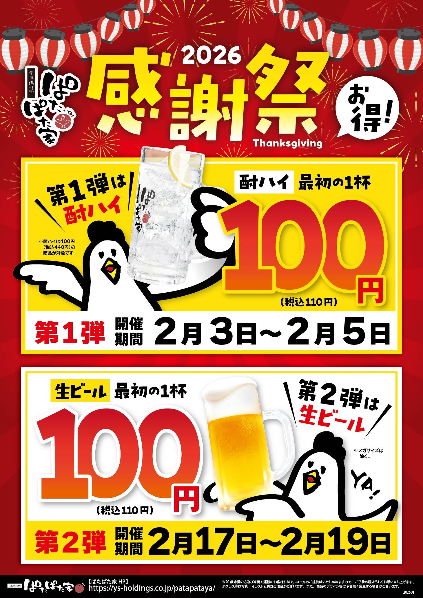 全国各地の名物「鶏料理」が楽しめる鶏肉のテーマパーク「ぱたぱた家」田町三田口店では、年に一度の「感謝祭」を2月に開催いたします。3日(火)~ 5日(木)までは17種類から選べる酎ハイを100円(税込110円)でご提供いたします。また、17日(火)~19日(木)までは、生ビールを100円(税込110円)でお楽しみいただけます。(酎ハイ、生ビールとも最初の1杯に限ります)この機会に北海道の美唄やきとりや、愛知の手羽先、宮崎のチキン南蛮など9種類の全国の「鶏肉グルメ」をはじめとした居酒屋メニューと一緒にお楽しみください。スタッフ一同、皆さまのご来店をお待ちしております。